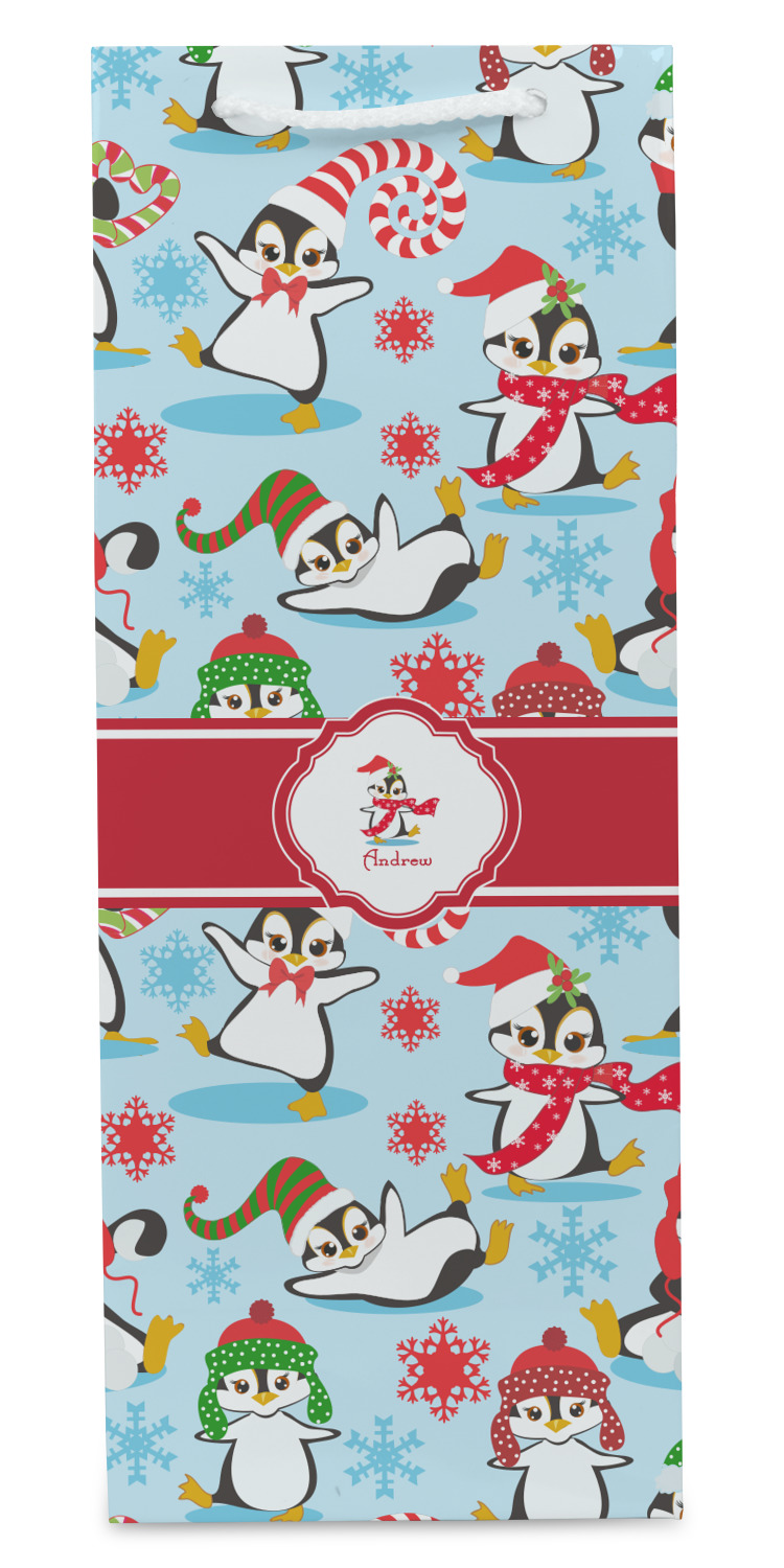 Penguins as Santa's little helpers? Everyone can agree this fun design of penguins clad in Santa hats and having a grand ole time up in the North Pole is absolutely adorable. The ribbon and label are red, and the label includes a little penguin, ready for the holidays, along with your name or text for personalization.