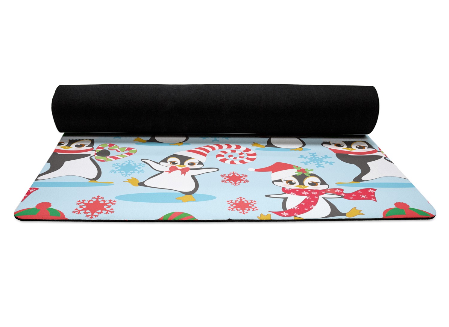 The top of the mats are dyed with your design using eco friendly non solvent inks. They have a smooth fleece felt top and feels very soft. The back of the mat is a sleek black and is a squishy non-slip texture to ensure that your mat does not slip on the floor. Our rubber backed mats are the perfect size at 68" x 24" and are just under approximately 1/4 inch thickness.