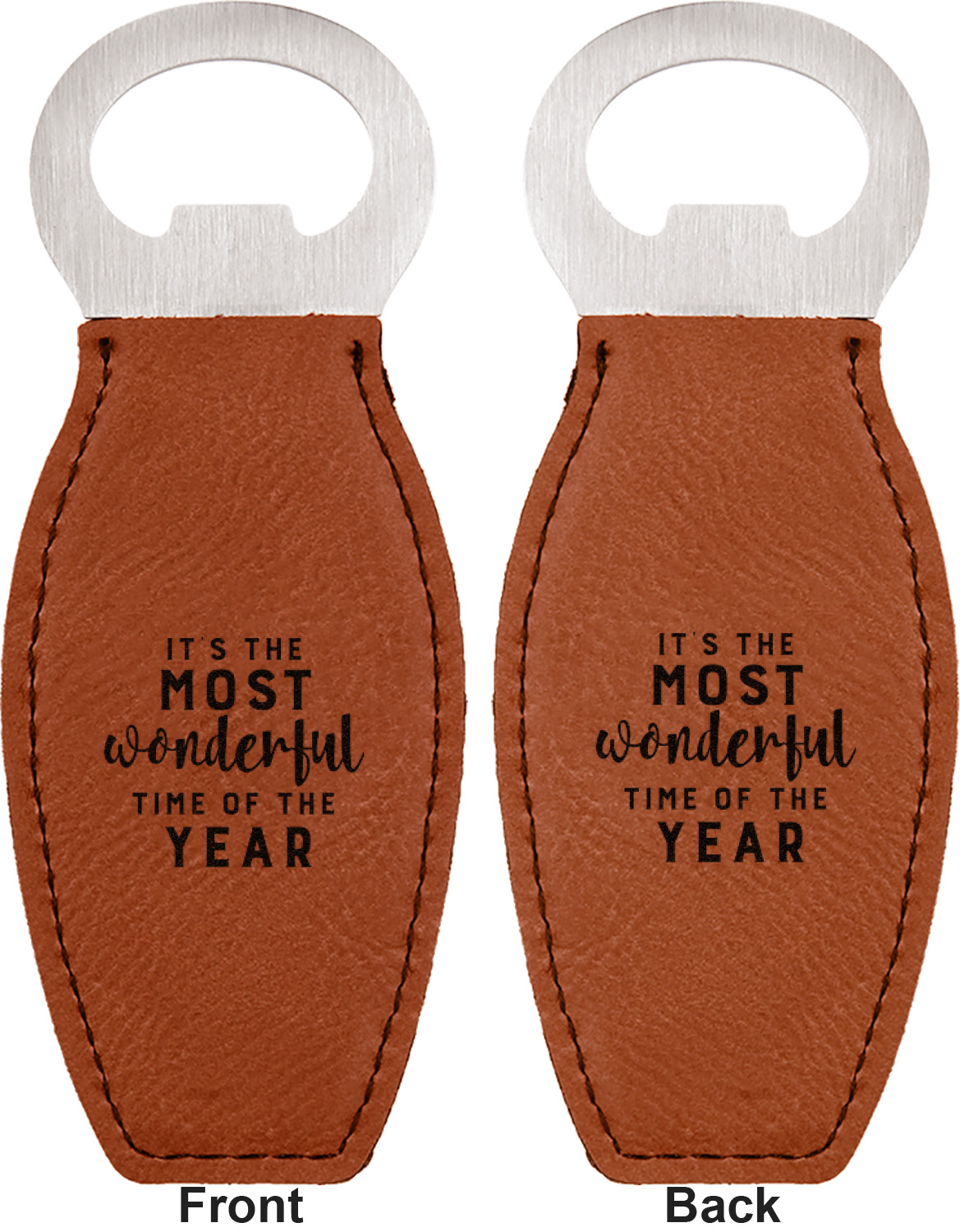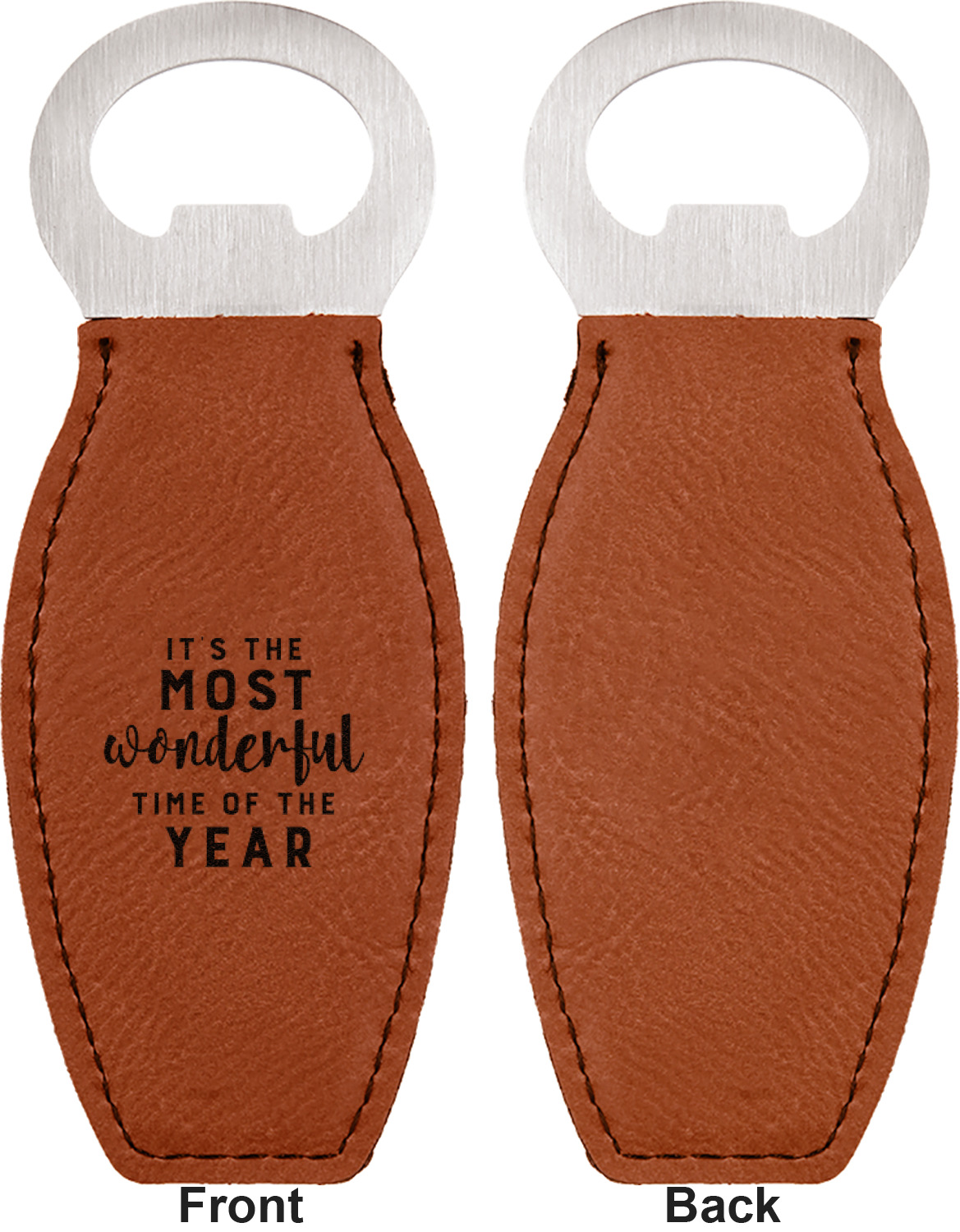 Built from stainless steel, these custom bottle openers are wrapped in a cognac-colored leatherette. Sharp, black stitching lines the edges for extra durability and a finished touch. Your personalization is laser-engraved onto the surface of this leatherette, leaving behind a crisp, black coloration. At 4.6 by 1.8 inches, this beer bottle opener gives you much of leverage when trying to open a stubborn bottle. On the opposite end of the opener, you'll find a magnet that you can use to display your new, unique bottle opener!