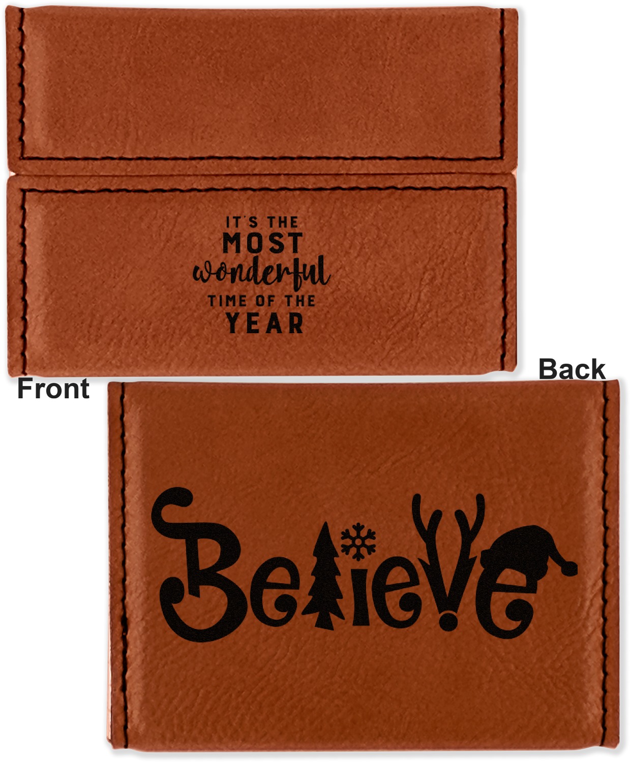 Your personalized design is laser engraved onto either the front, or the front and back of the card holder, depending on the model you purchase. Once engraved, the design will appear a darkened black against the cognac color of the leatherette.