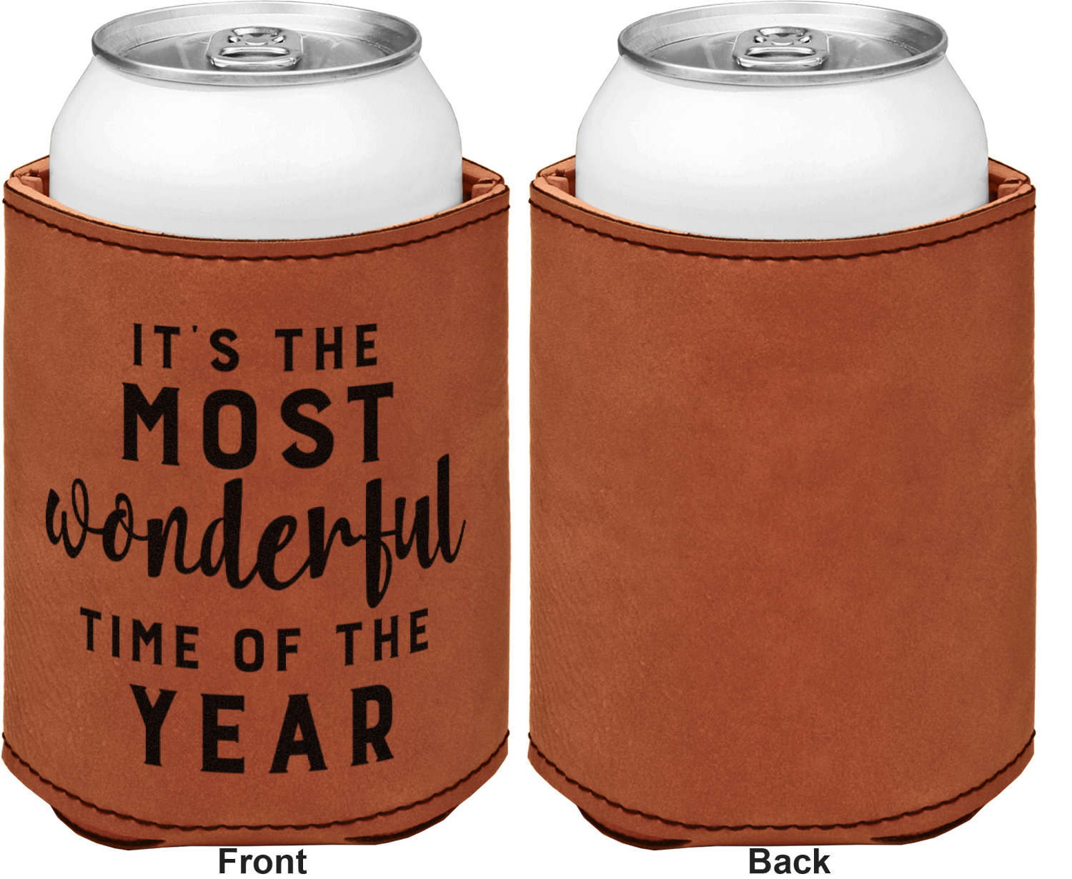 This can sleeve is made from a cognac-brown leatherette and stitched with a sturdy, black thread. A slim padding lines the inside of your can sleeve to allow for a better fit once your drink is inserted. The sleeve itself measures at 4 by 4.5 inches, allowing this custom can sleeve to accommodate most canned drinks. Your personalized design can be engraved on the front and back, or solely the front. When laser-engraved, your design appears as a black coloration which contrasts the leatherette nicely.