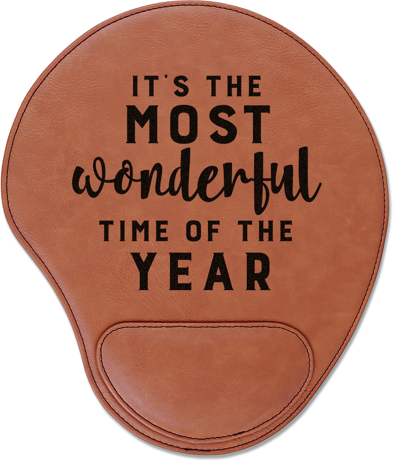 In a rounded shape, this mouse pad is made of a luxurious, cognac-colored leatherette. The nature of this material allows your mouse to glide smoothly across its surface. Strong stitching lines the edges to guarantee stability and strength. As added support for tired wrists, your personalized mouse pad features a supportive wrist rest at its bottom. This model measures at 10.25" x 9", while its wrist pad is approximately 5" x 2.75", with a thickness of 0.75". Your personalized design is laser engraved into the front face of this mouse pad.