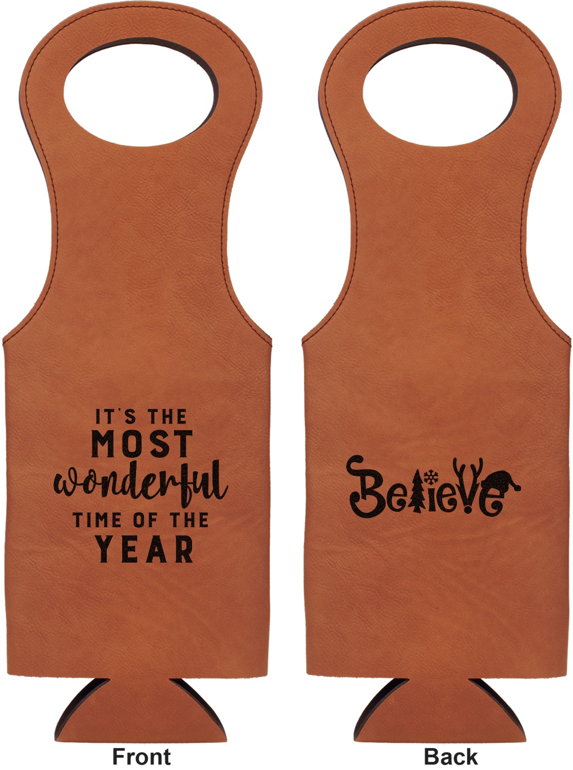 This wine carrier is made from a stunning leatherette, in a cognac-brown color. Strong, black stitching lines the sides of your wine bottle bag and provides extra durability. The interior is lined with a padded, black material to allow for a snug fit once your bottle is placed inside. At the top of this wine gift bag, you'll find two oval shaped handles that elegantly complements the rest of the bag's style. We provide you with the option of laser-engraving the front, or the front and back of your new personalized wine bag!
