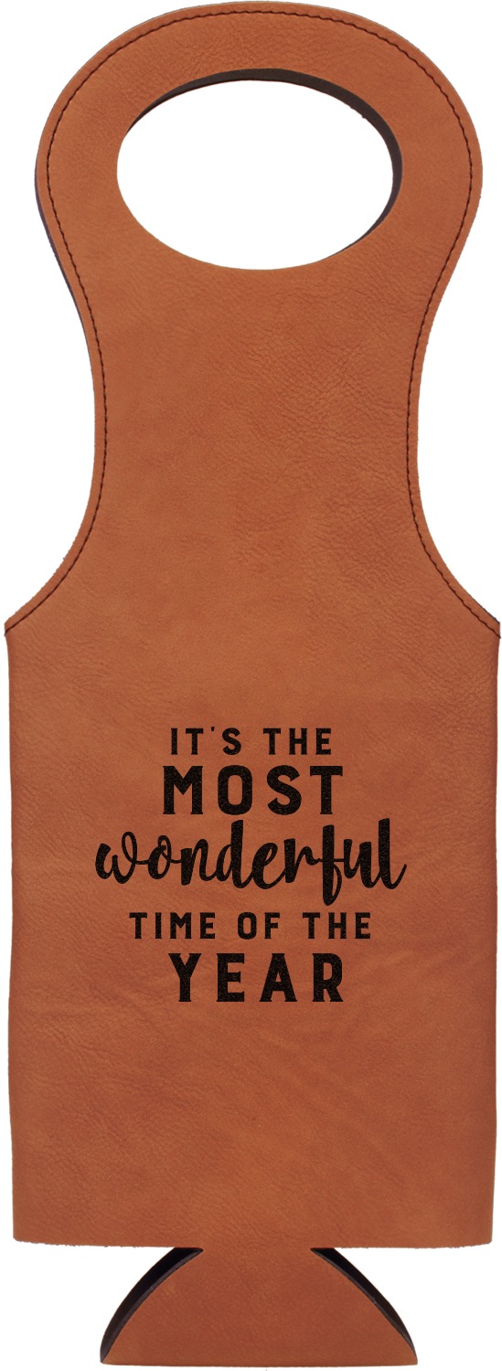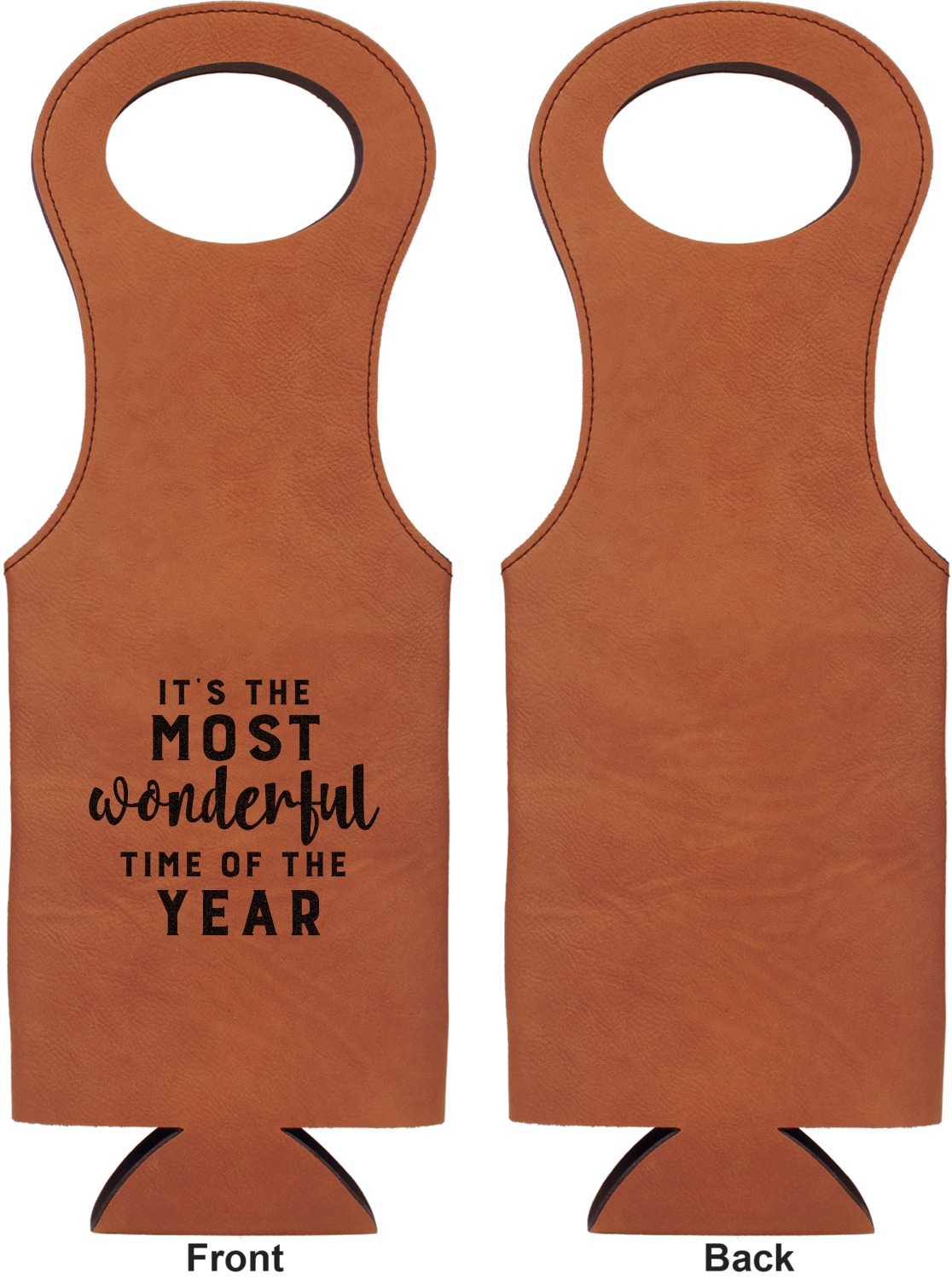 This wine carrier is made from a stunning leatherette, in a cognac-brown color. Strong, black stitching lines the sides of your wine bottle bag and provides extra durability. The interior is lined with a padded, black material to allow for a snug fit once your bottle is placed inside. At the top of this wine gift bag, you'll find two oval shaped handles that elegantly complements the rest of the bag's style. We provide you with the option of laser-engraving the front, or the front and back of your new personalized wine bag!