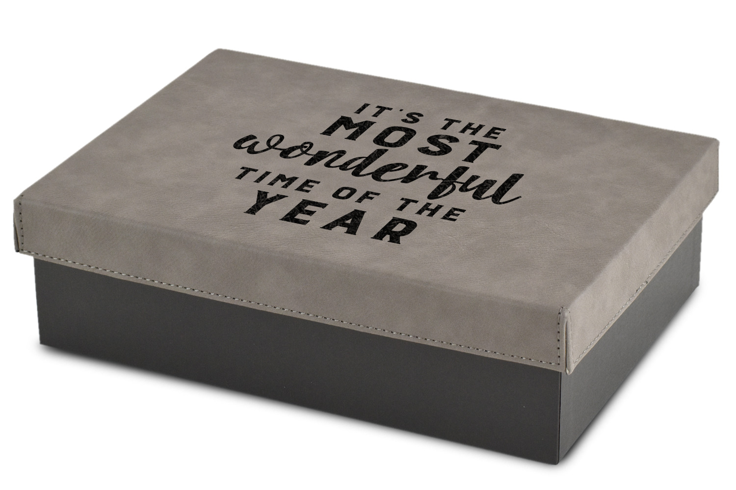 These gift boxes are available in 3 different sizes to accommodate various sized gifts. Available in gray as a neutral color for any occasion as well as to showcase your design boldly. Engraved with a laser this high quality paper board and faux leather gift box is unique and makes any gift stand out.