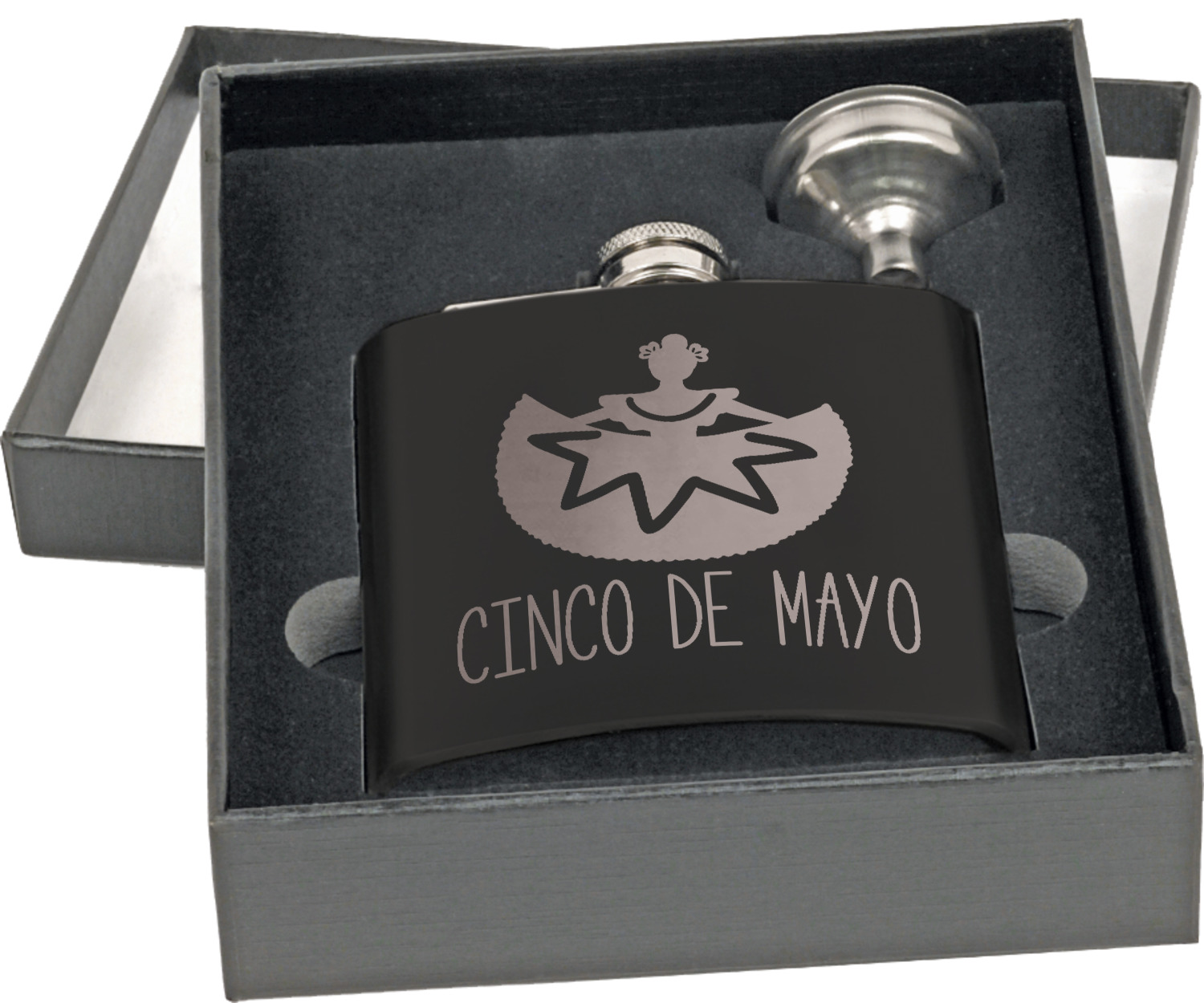 Built from a stainless steel and then covered with a black coating, this hip flask, has a very classy appearance. Similar to the standard flask, this stainless steel flask has the traditional curved shape for a snug fit in your palm. This flask set also includes a traditional screw and flip lid and liquid funnel in a gift box. At 4 by 4.5 inches, this flask can hold up to 6 ounces. Your personalized design is laser-engraved across the front of this flask.