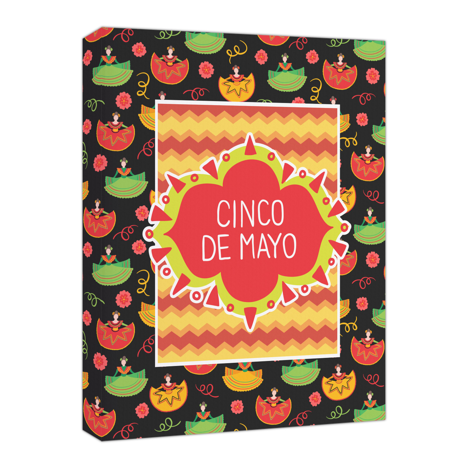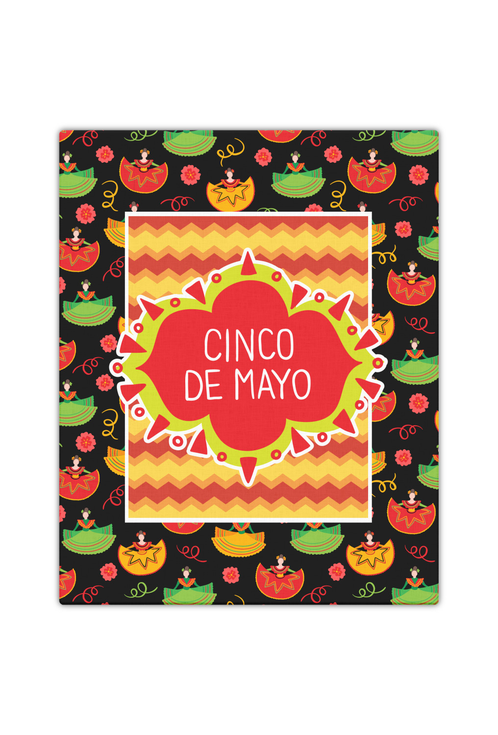 The design has two layers, one inside the other. The inner layer is a fun orange and red chevron. The outer layer has illustrated ladies wearing traditional Mexican skirts with flowers and confetti all around them. The background of this pattern is black, which really makes the bright colors of this pattern stand out. In the very middle of the design is a fun frame with the words "Cinco de Mayo" written inside.