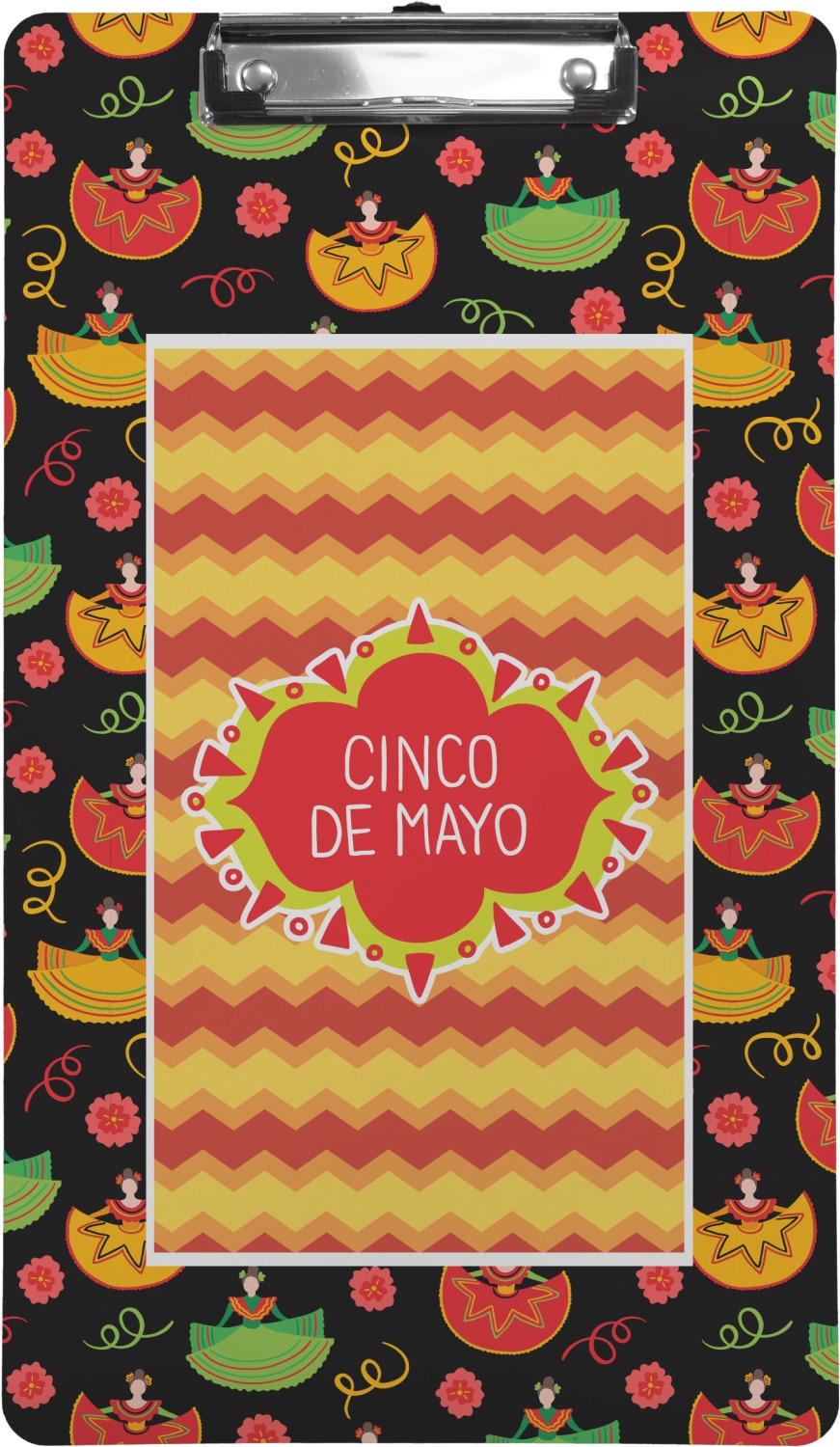 The design has two layers, one inside the other. The inner layer is a fun orange and red chevron. The outer layer has illustrated ladies wearing traditional Mexican skirts with flowers and confetti all around them. The background of this pattern is black, which really makes the bright colors of this pattern stand out. In the very middle of the design is a fun frame with the words "Cinco de Mayo" written inside.