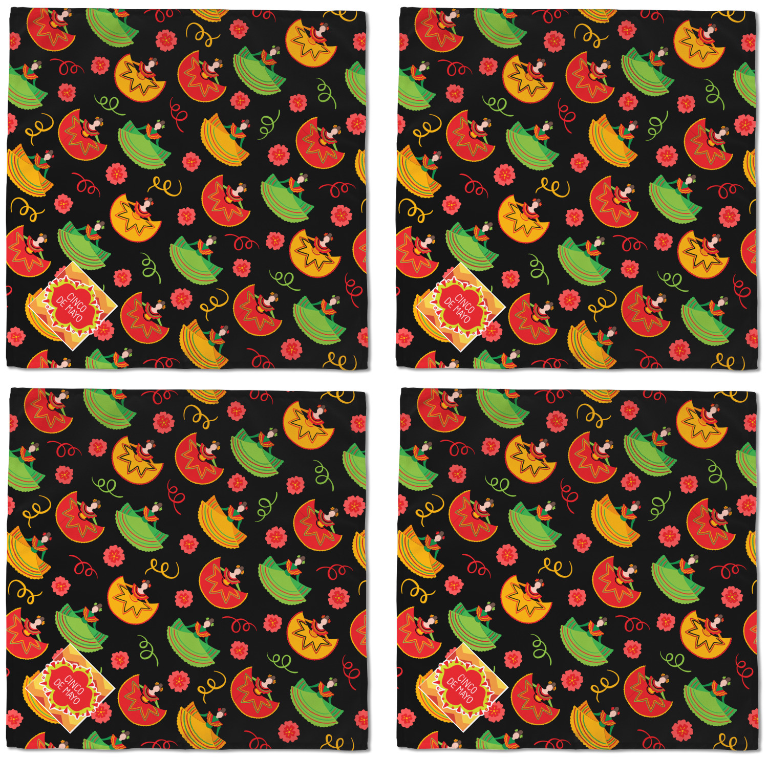 The design has two layers, one inside the other. The inner layer is a fun orange and red chevron. The outer layer has illustrated ladies wearing traditional Mexican skirts with flowers and confetti all around them. The background of this pattern is black, which really makes the bright colors of this pattern stand out. In the very middle of the design is a fun frame with the words "Cinco de Mayo" written inside.