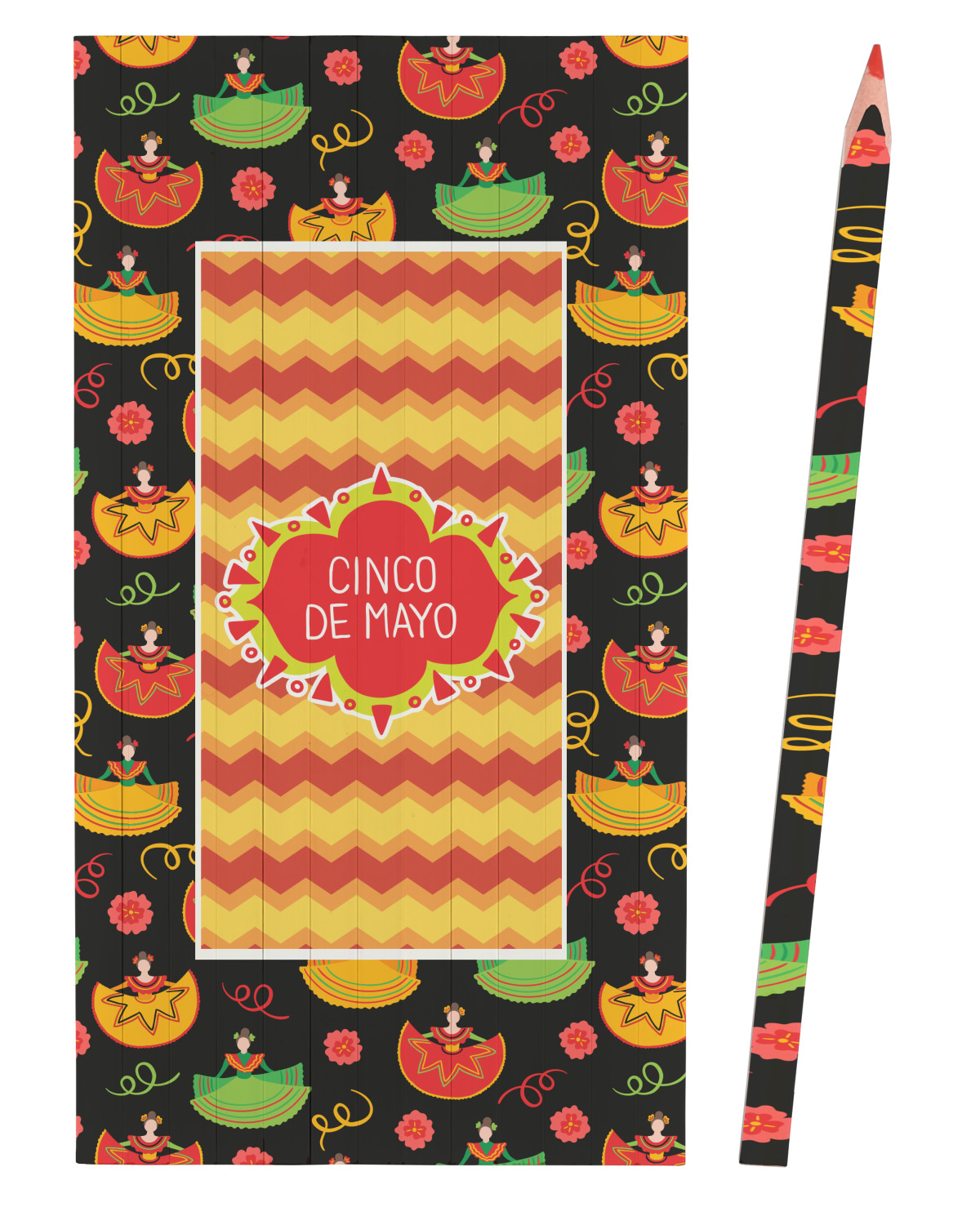The design has two layers, one inside the other. The inner layer is a fun orange and red chevron. The outer layer has illustrated ladies wearing traditional Mexican skirts with flowers and confetti all around them. The background of this pattern is black, which really makes the bright colors of this pattern stand out. In the very middle of the design is a fun frame with the words "Cinco de Mayo" written inside.