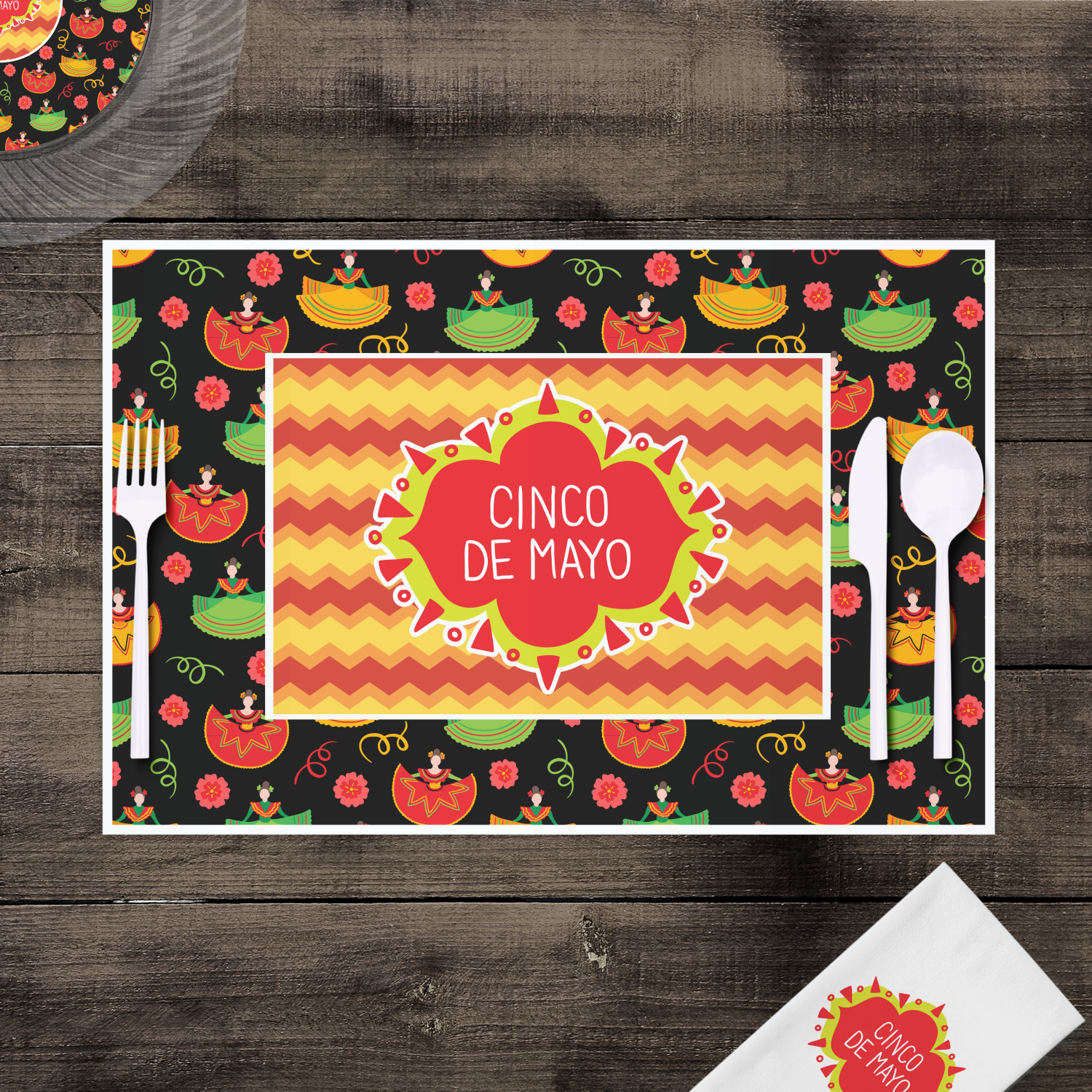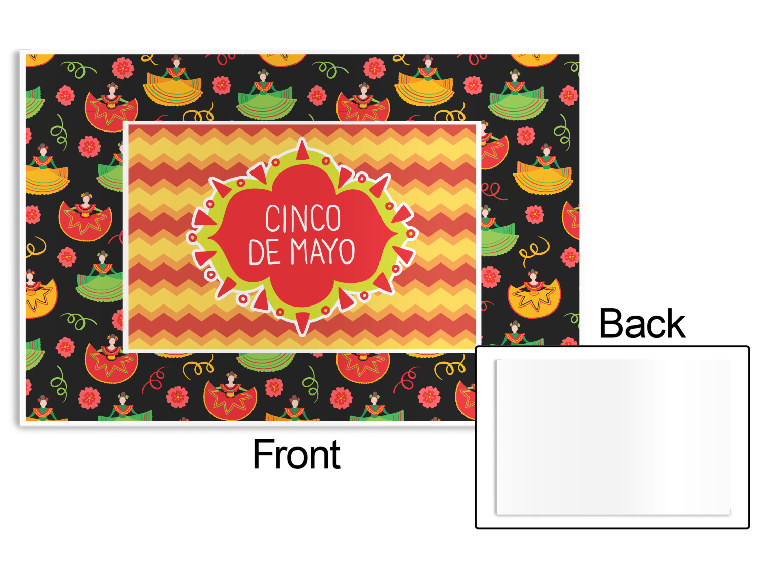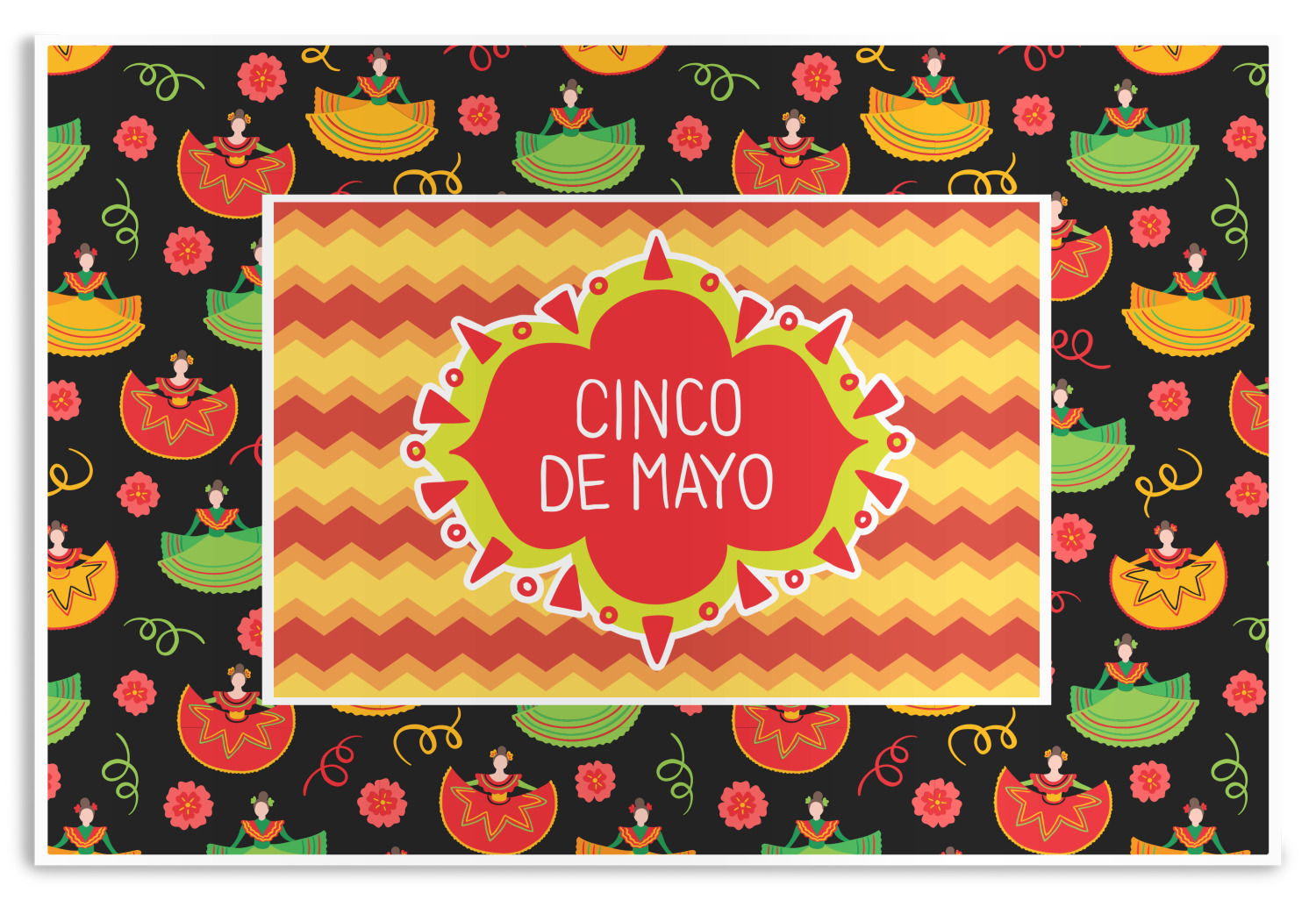 The design has two layers, one inside the other. The inner layer is a fun orange and red chevron. The outer layer has illustrated ladies wearing traditional Mexican skirts with flowers and confetti all around them. The background of this pattern is black, which really makes the bright colors of this pattern stand out. In the very middle of the design is a fun frame with the words "Cinco de Mayo" written inside.