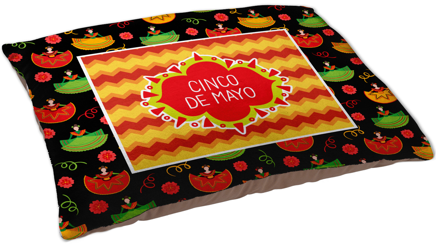 The design has two layers, one inside the other. The inner layer is a fun orange and red chevron. The outer layer has illustrated ladies wearing traditional Mexican skirts with flowers and confetti all around them. The background of this pattern is black, which really makes the bright colors of this pattern stand out. In the very middle of the design is a fun frame with the words "Cinco de Mayo" written inside.