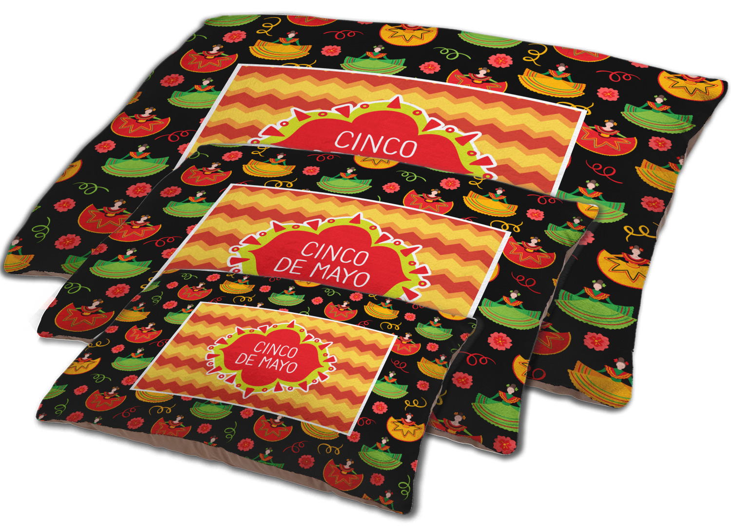 The design has two layers, one inside the other. The inner layer is a fun orange and red chevron. The outer layer has illustrated ladies wearing traditional Mexican skirts with flowers and confetti all around them. The background of this pattern is black, which really makes the bright colors of this pattern stand out. In the very middle of the design is a fun frame with the words "Cinco de Mayo" written inside.