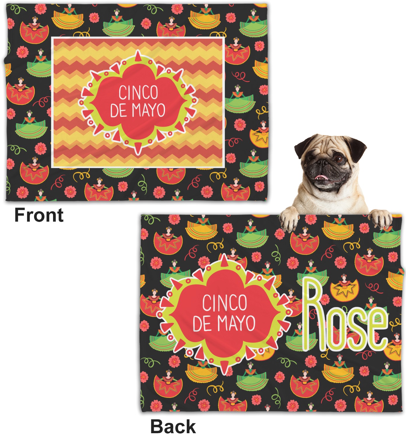 The design has two layers, one inside the other. The inner layer is a fun orange and red chevron. The outer layer has illustrated ladies wearing traditional Mexican skirts with flowers and confetti all around them. The background of this pattern is black, which really makes the bright colors of this pattern stand out. In the very middle of the design is a fun frame with the words "Cinco de Mayo" written inside.