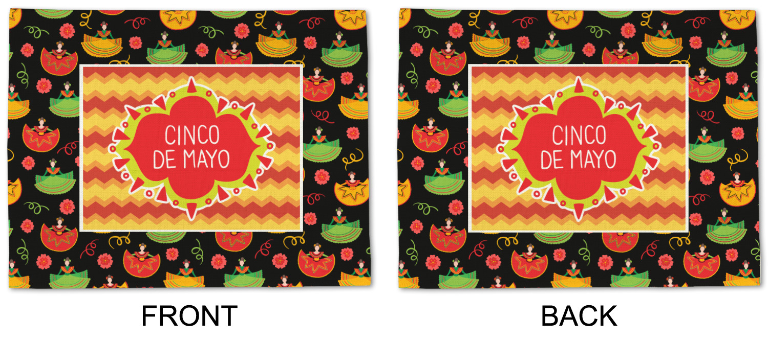 The design has two layers, one inside the other. The inner layer is a fun orange and red chevron. The outer layer has illustrated ladies wearing traditional Mexican skirts with flowers and confetti all around them. The background of this pattern is black, which really makes the bright colors of this pattern stand out. In the very middle of the design is a fun frame with the words "Cinco de Mayo" written inside.