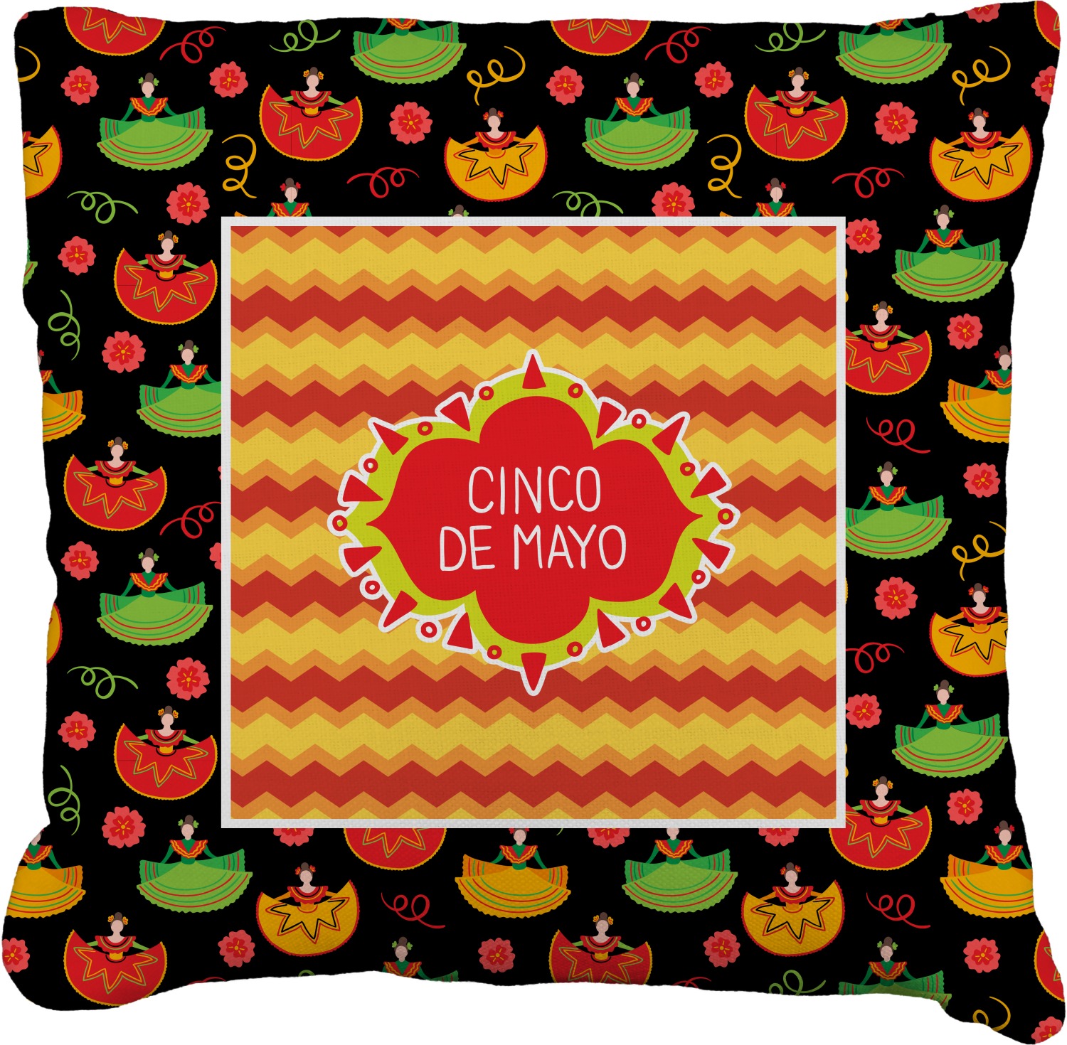 The design has two layers, one inside the other. The inner layer is a fun orange and red chevron. The outer layer has illustrated ladies wearing traditional Mexican skirts with flowers and confetti all around them. The background of this pattern is black, which really makes the bright colors of this pattern stand out. In the very middle of the design is a fun frame with the words "Cinco de Mayo" written inside.