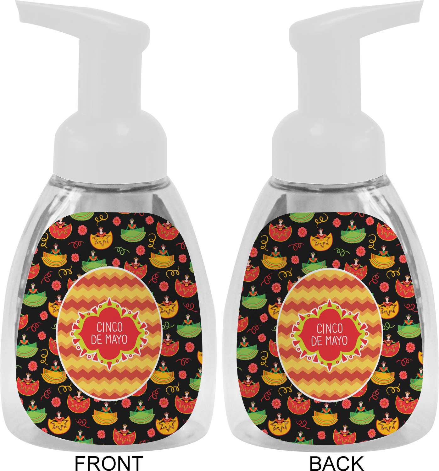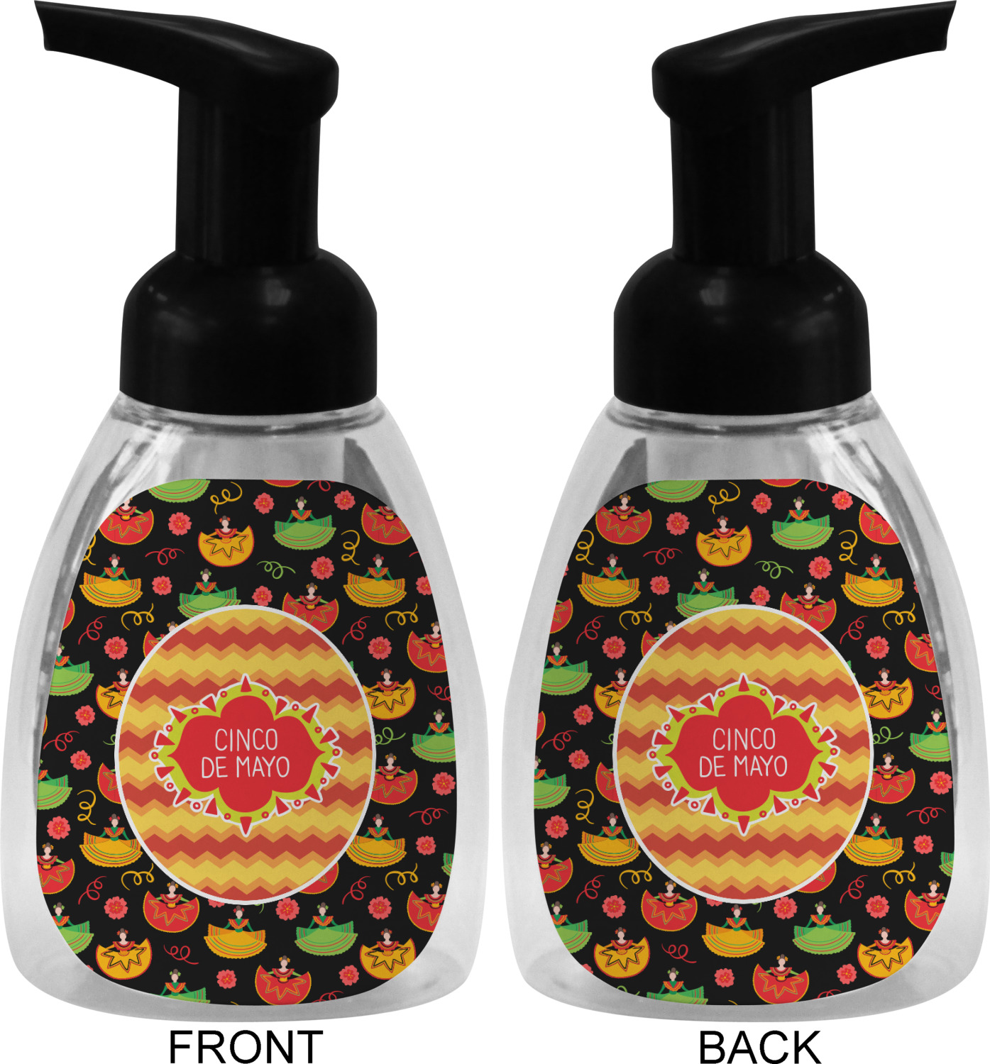 This soap dispenser is made of a robust plastic and has a clear base. The included soap pump is available in black or white color. This dispenser is 6.5 inches tall, 3 inches wide, and 2 inches deep. We display your customized designs on the front and back sides of these foaming hand soap dispensers.
