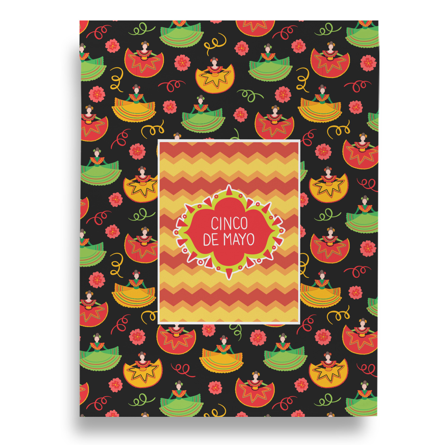 The design has two layers, one inside the other. The inner layer is a fun orange and red chevron. The outer layer has illustrated ladies wearing traditional Mexican skirts with flowers and confetti all around them. The background of this pattern is black, which really makes the bright colors of this pattern stand out. In the very middle of the design is a fun frame with the words "Cinco de Mayo" written inside.