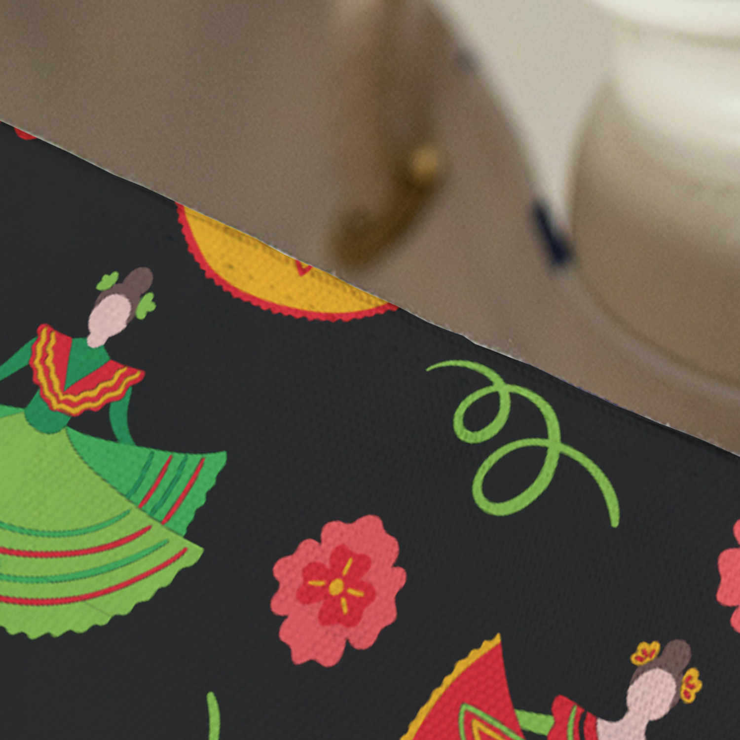 The design has two layers, one inside the other. The inner layer is a fun orange and red chevron. The outer layer has illustrated ladies wearing traditional Mexican skirts with flowers and confetti all around them. The background of this pattern is black, which really makes the bright colors of this pattern stand out. In the very middle of the design is a fun frame with the words "Cinco de Mayo" written inside.
