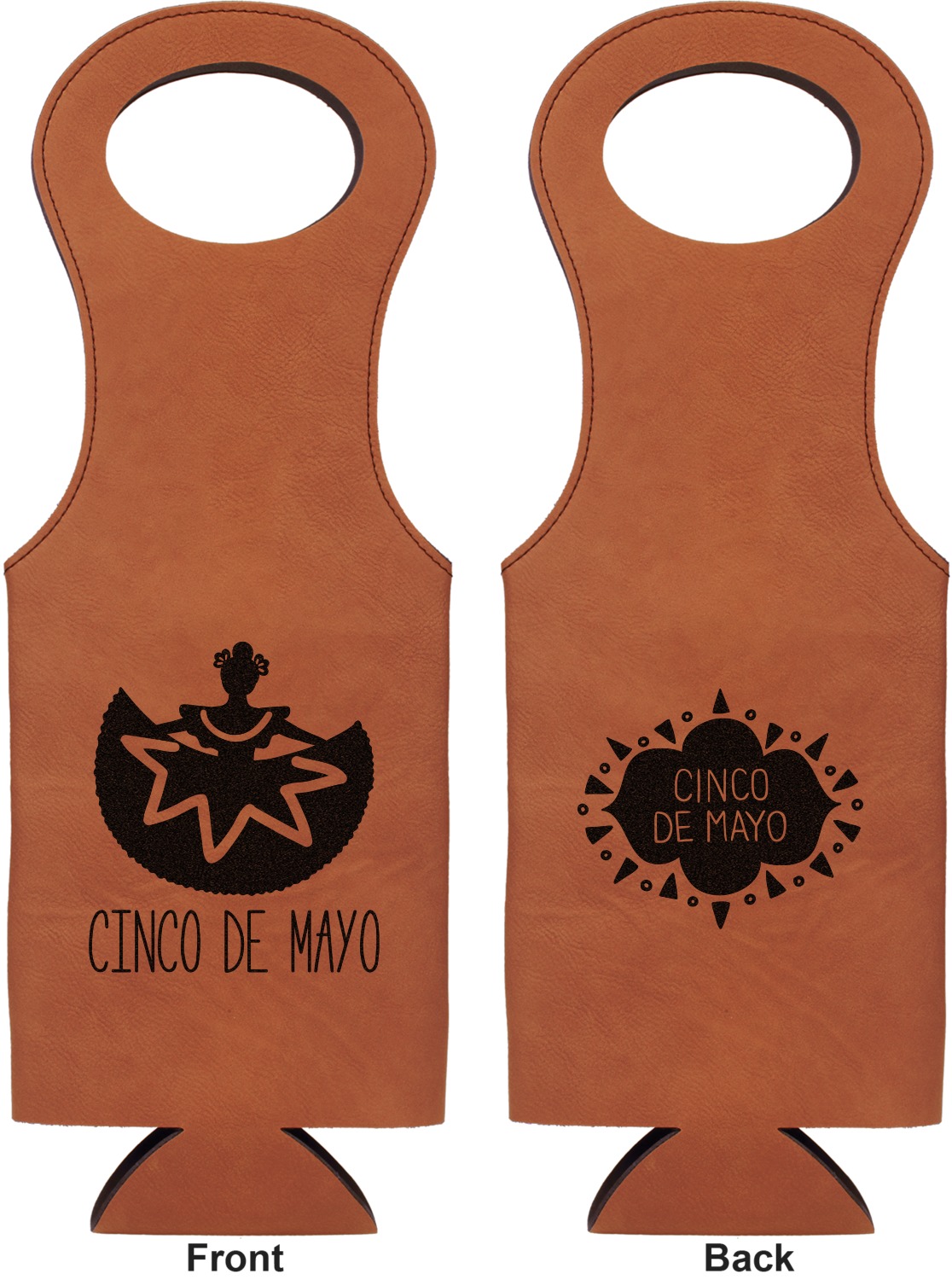 This wine carrier is made from a stunning leatherette, in a cognac-brown color. Strong, black stitching lines the sides of your wine bottle bag and provides extra durability. The interior is lined with a padded, black material to allow for a snug fit once your bottle is placed inside. At the top of this wine gift bag, you'll find two oval shaped handles that elegantly complements the rest of the bag's style. We provide you with the option of laser-engraving the front, or the front and back of your new personalized wine bag!