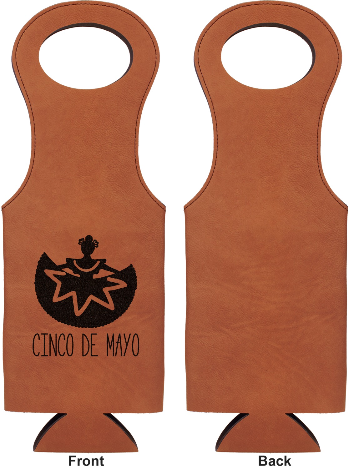 This wine carrier is made from a stunning leatherette, in a cognac-brown color. Strong, black stitching lines the sides of your wine bottle bag and provides extra durability. The interior is lined with a padded, black material to allow for a snug fit once your bottle is placed inside. At the top of this wine gift bag, you'll find two oval shaped handles that elegantly complements the rest of the bag's style. We provide you with the option of laser-engraving the front, or the front and back of your new personalized wine bag!