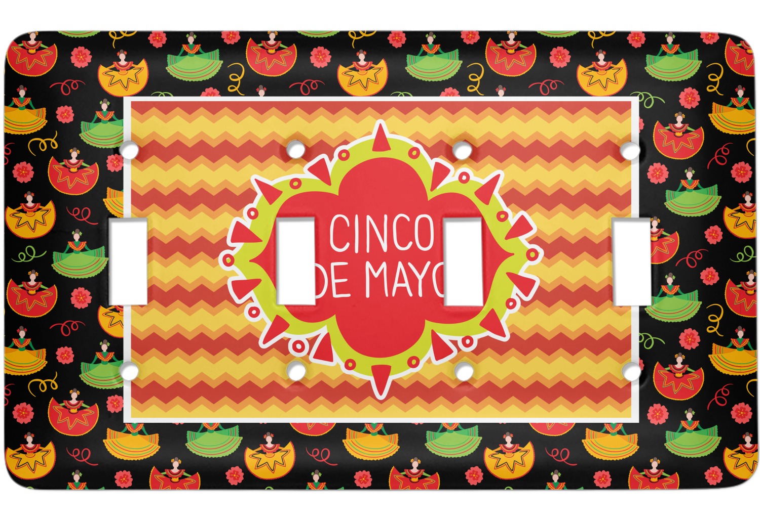 The design has two layers, one inside the other. The inner layer is a fun orange and red chevron. The outer layer has illustrated ladies wearing traditional Mexican skirts with flowers and confetti all around them. The background of this pattern is black, which really makes the bright colors of this pattern stand out. In the very middle of the design is a fun frame with the words "Cinco de Mayo" written inside.
