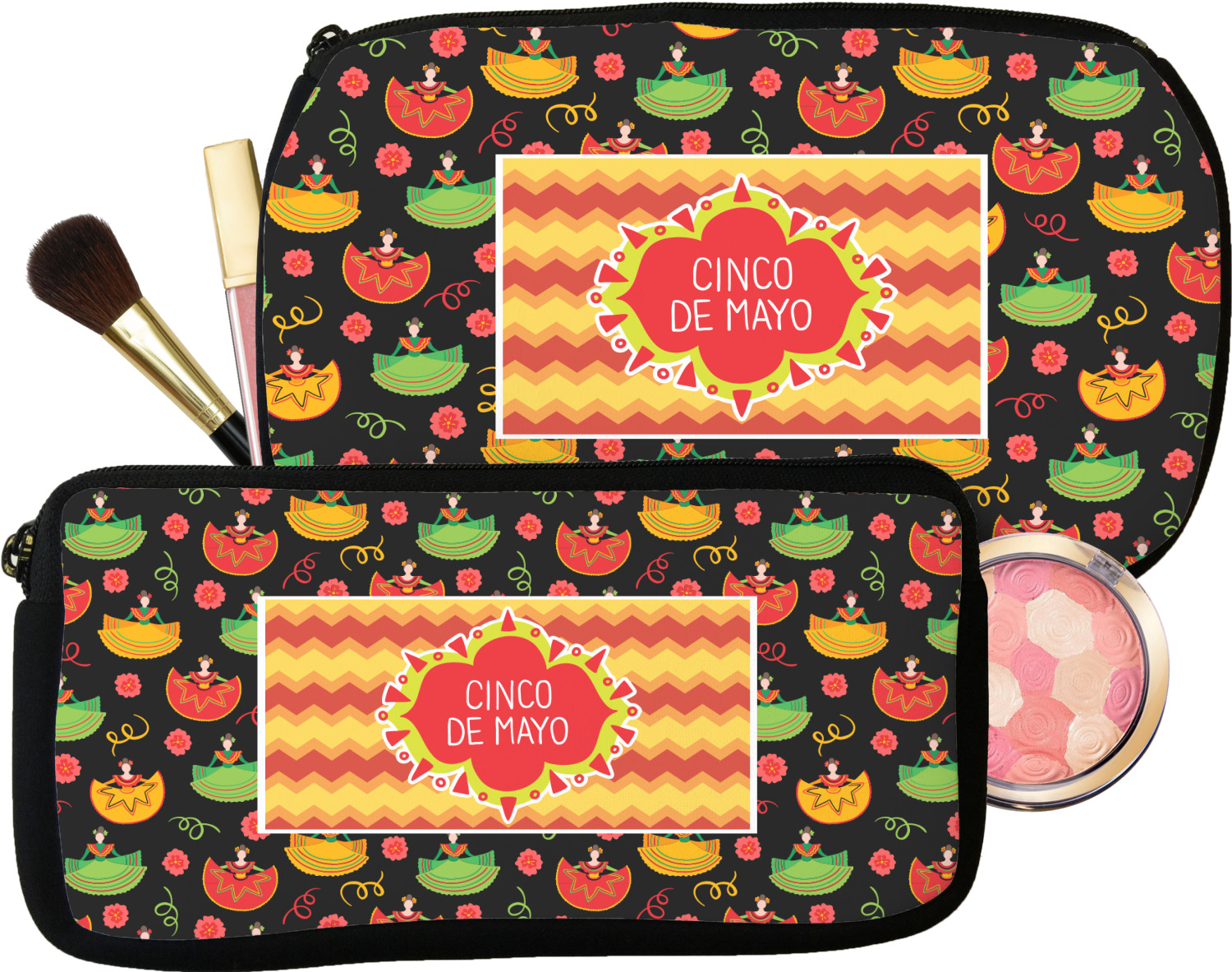 The design has two layers, one inside the other. The inner layer is a fun orange and red chevron. The outer layer has illustrated ladies wearing traditional Mexican skirts with flowers and confetti all around them. The background of this pattern is black, which really makes the bright colors of this pattern stand out. In the very middle of the design is a fun frame with the words "Cinco de Mayo" written inside.