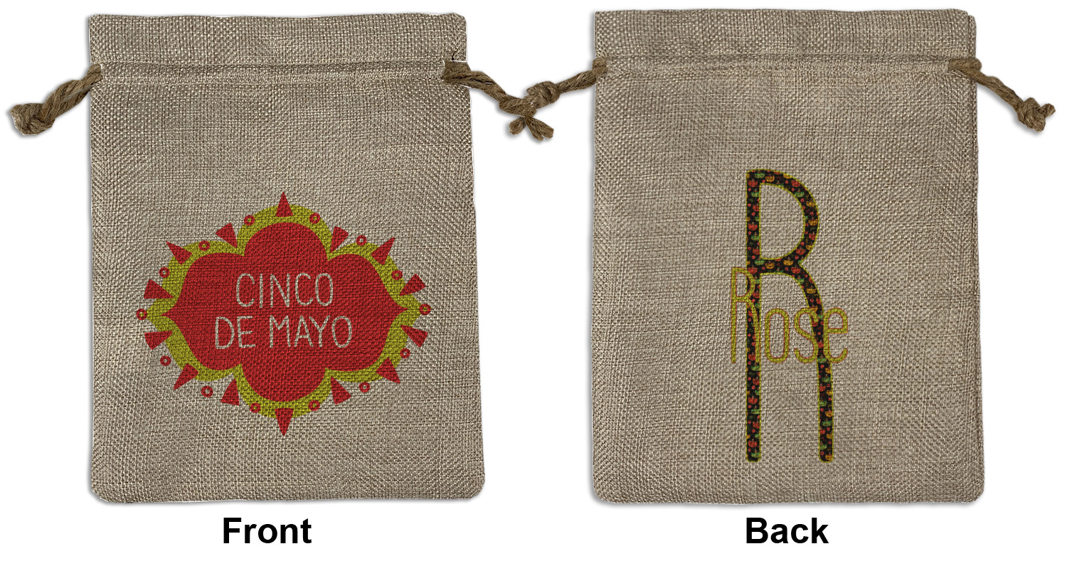 We sell our Burlap Gift Bags in 3 variant sized bags. Made with burlap polyester, each personalized bag can be secured with a twine drawstring pull. Your custom design is available to print on one side or both sides - completely up to you! The sizes of the bags measure approximately 4.5" x 6.5" for the smallest size, 6.5" x 8.0" for the medium size, and 6.5" x 13.5" for the large-sized bag.