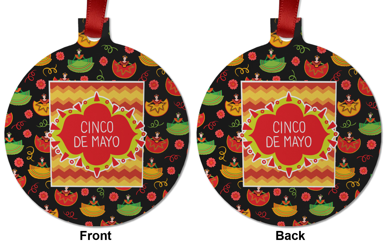 The design has two layers, one inside the other. The inner layer is a fun orange and red chevron. The outer layer has illustrated ladies wearing traditional Mexican skirts with flowers and confetti all around them. The background of this pattern is black, which really makes the bright colors of this pattern stand out. In the very middle of the design is a fun frame with the words "Cinco de Mayo" written inside.