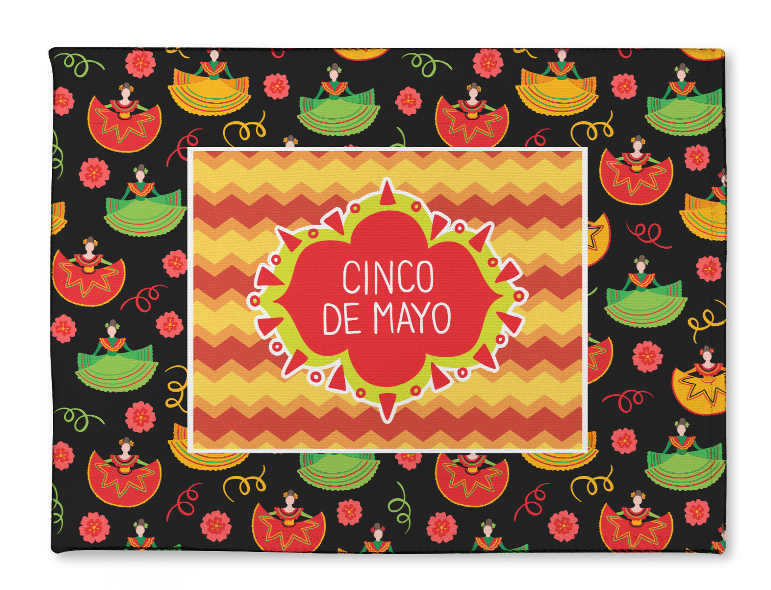 The design has two layers, one inside the other. The inner layer is a fun orange and red chevron. The outer layer has illustrated ladies wearing traditional Mexican skirts with flowers and confetti all around them. The background of this pattern is black, which really makes the bright colors of this pattern stand out. In the very middle of the design is a fun frame with the words "Cinco de Mayo" written inside.