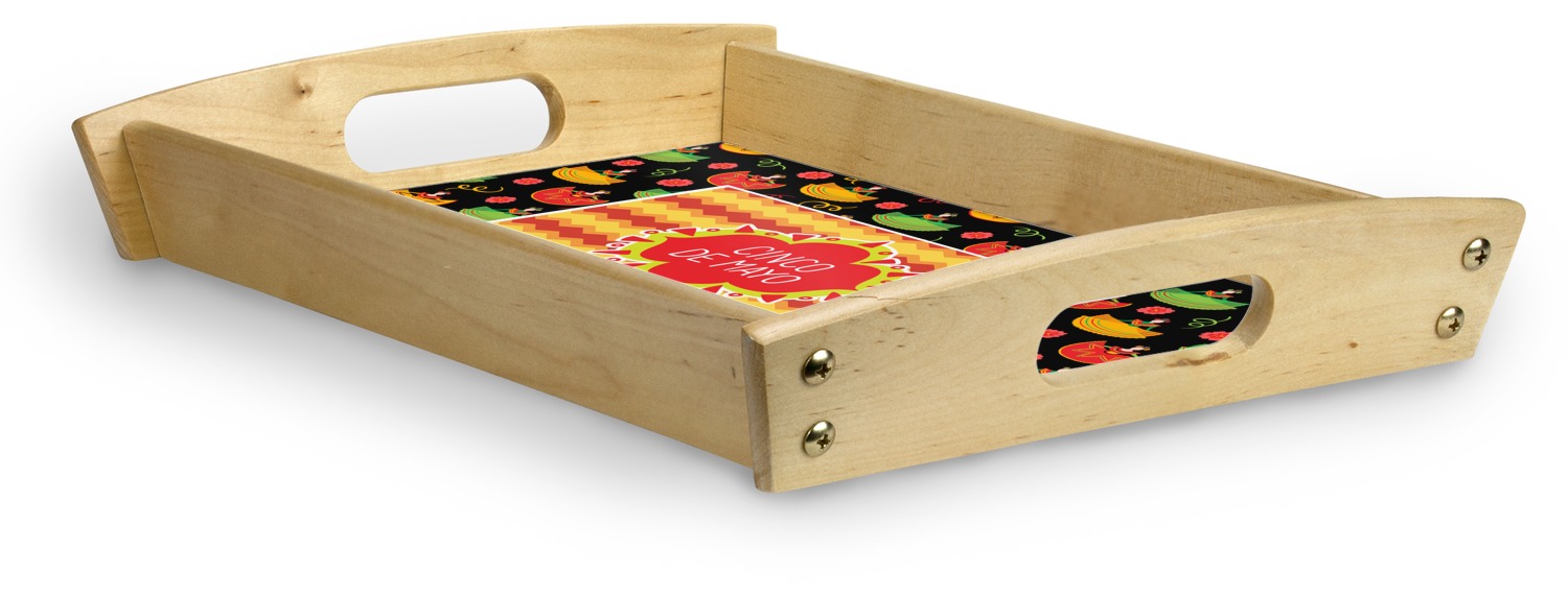 This serving tray with handles features square edges and two rounded sides, creating a very modern look. Each side is fabricated from a beautifully cut, natural wood. The bottom of the interior of the tray displays your customized design in bright, vibrant color. The tray is sold in both a black color and a natural wood look. Each variation of the wood serving tray has two sizes: Small, which is 14" x 10" x 2.25", and Large, which is 19.5" x 13.5" x 2.75".