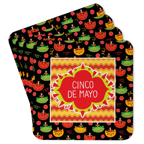 The design has two layers, one inside the other. The inner layer is a fun orange and red chevron. The outer layer has illustrated ladies wearing traditional Mexican skirts with flowers and confetti all around them. The background of this pattern is black, which really makes the bright colors of this pattern stand out. In the very middle of the design is a fun frame with the words "Cinco de Mayo" written inside.