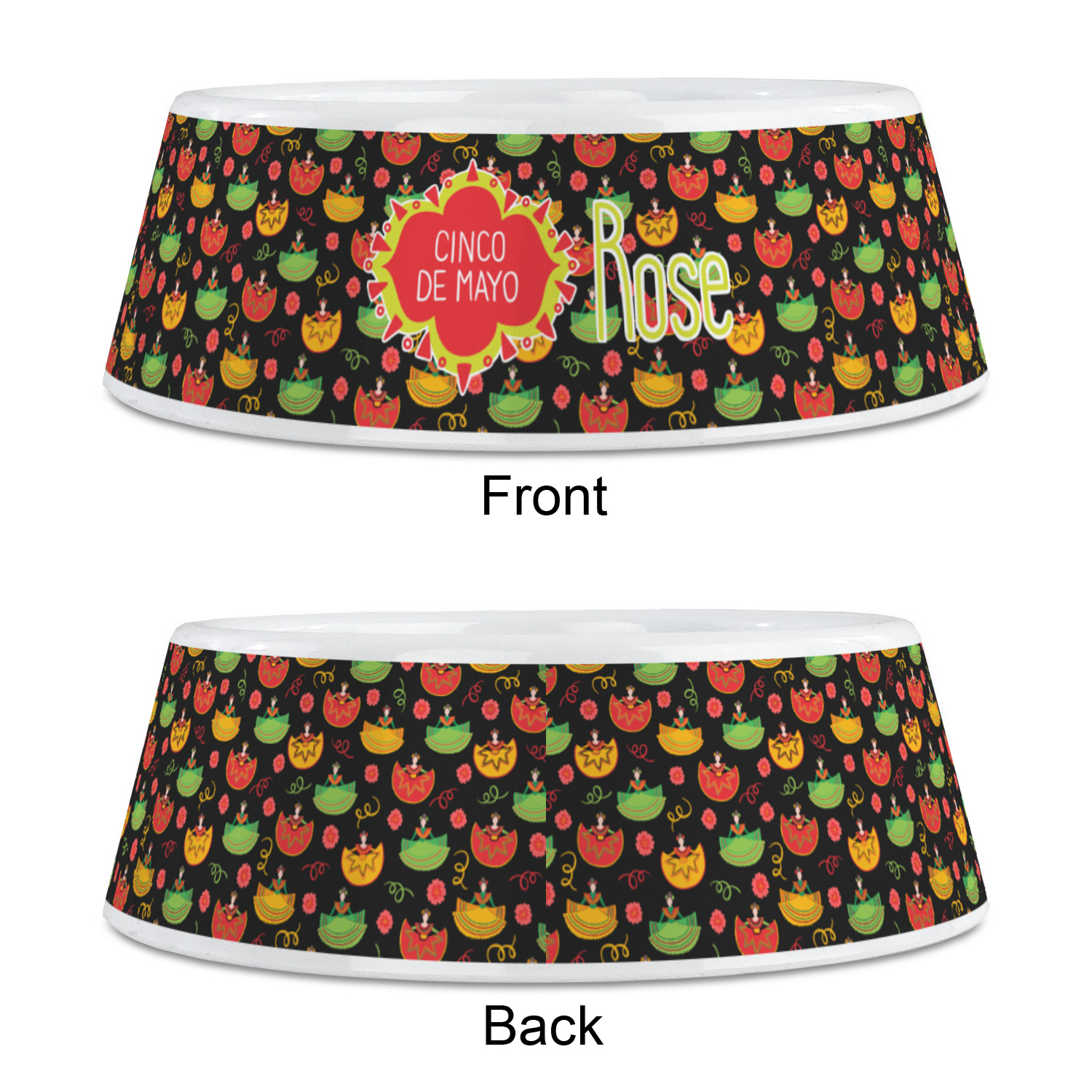 The design has two layers, one inside the other. The inner layer is a fun orange and red chevron. The outer layer has illustrated ladies wearing traditional Mexican skirts with flowers and confetti all around them. The background of this pattern is black, which really makes the bright colors of this pattern stand out. In the very middle of the design is a fun frame with the words "Cinco de Mayo" written inside.