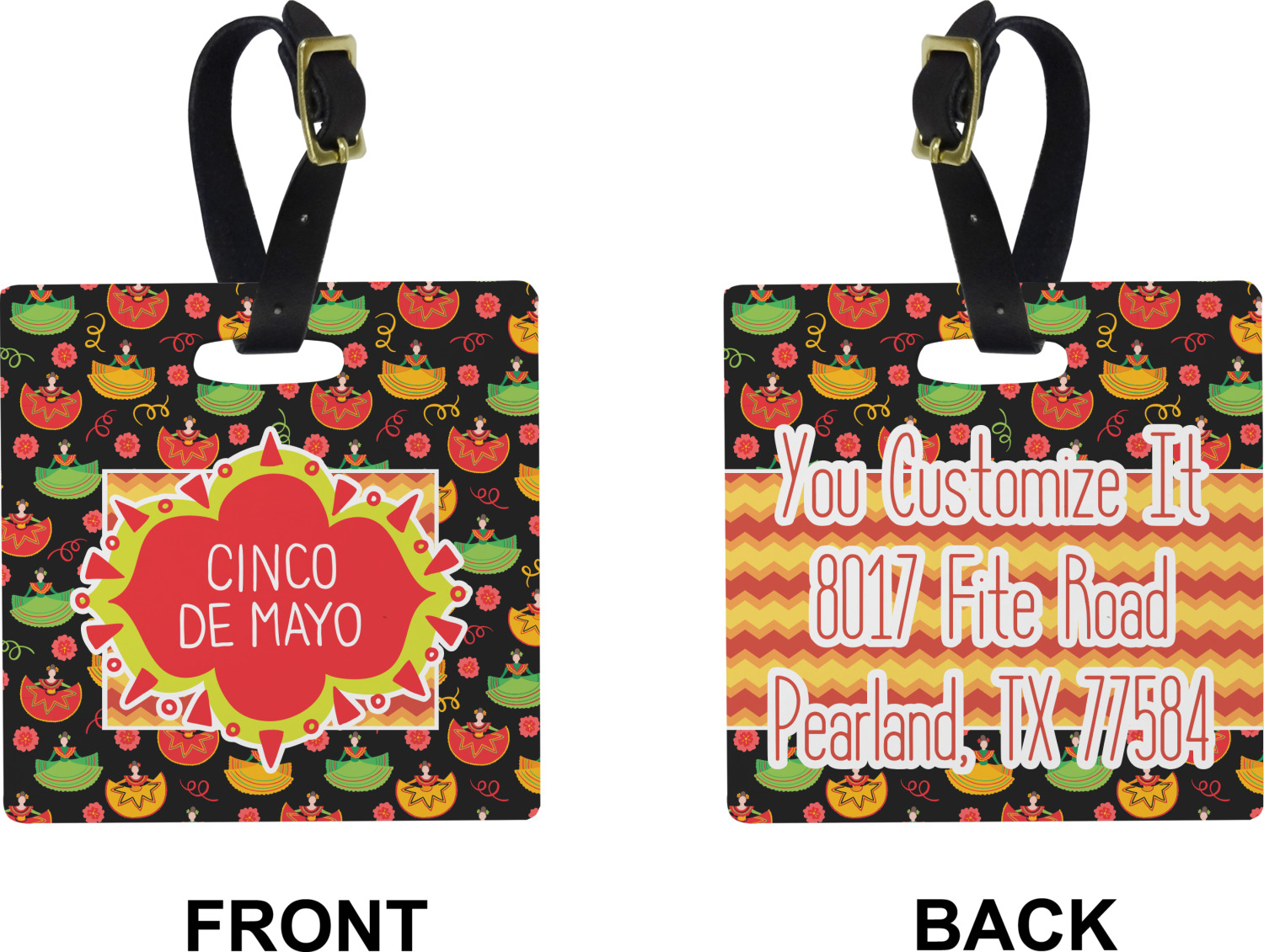 These personalized bag tags are sold in a variety of shapes, so that you may find the product that meets your vision exactly. We sell a round luggage tag, which measures at approximately 4" x 4". Our square luggage tag is about 3.5" x 3.5", while our rectangular version is 2.75" x 4 ".