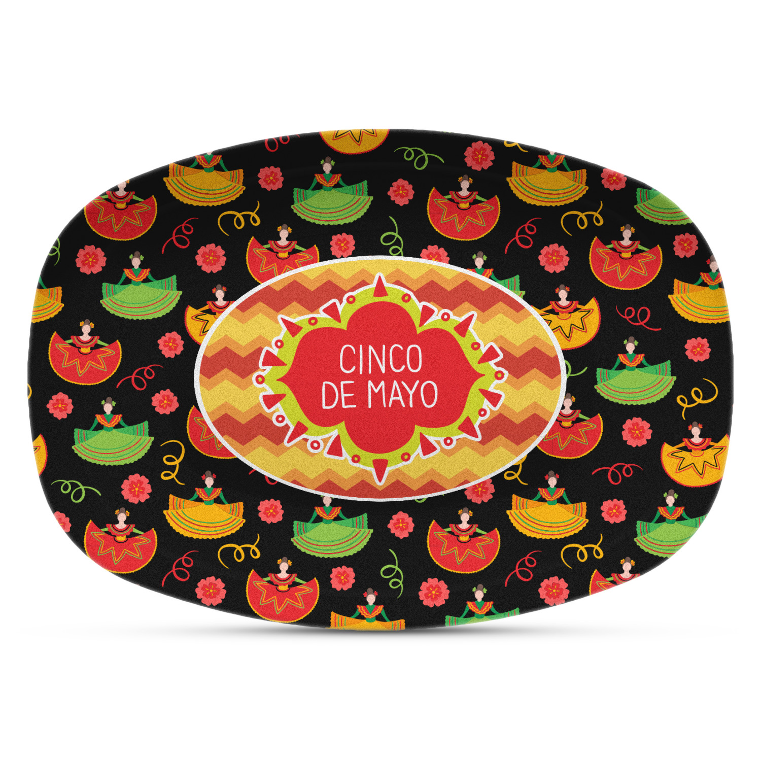 The design has two layers, one inside the other. The inner layer is a fun orange and red chevron. The outer layer has illustrated ladies wearing traditional Mexican skirts with flowers and confetti all around them. The background of this pattern is black, which really makes the bright colors of this pattern stand out. In the very middle of the design is a fun frame with the words "Cinco de Mayo" written inside.