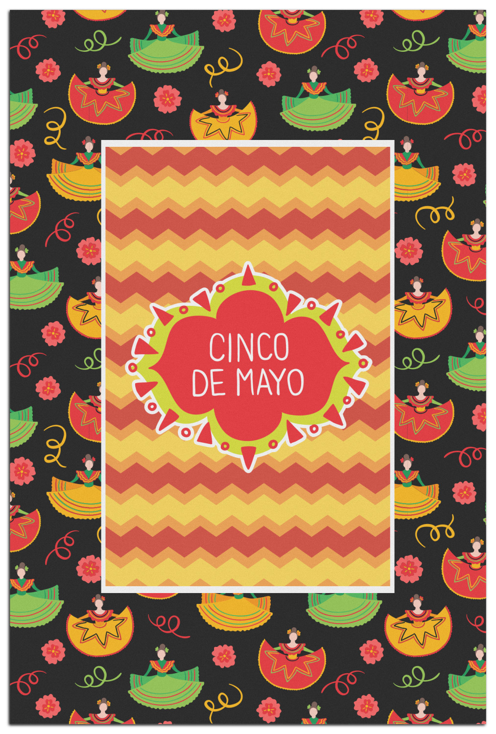 The design has two layers, one inside the other. The inner layer is a fun orange and red chevron. The outer layer has illustrated ladies wearing traditional Mexican skirts with flowers and confetti all around them. The background of this pattern is black, which really makes the bright colors of this pattern stand out. In the very middle of the design is a fun frame with the words "Cinco de Mayo" written inside.