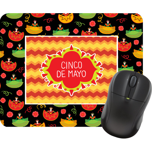 The design has two layers, one inside the other. The inner layer is a fun orange and red chevron. The outer layer has illustrated ladies wearing traditional Mexican skirts with flowers and confetti all around them. The background of this pattern is black, which really makes the bright colors of this pattern stand out. In the very middle of the design is a fun frame with the words "Cinco de Mayo" written inside.
