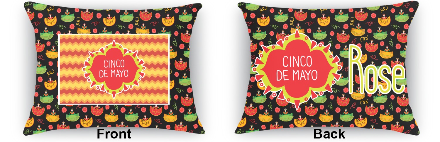 The design has two layers, one inside the other. The inner layer is a fun orange and red chevron. The outer layer has illustrated ladies wearing traditional Mexican skirts with flowers and confetti all around them. The background of this pattern is black, which really makes the bright colors of this pattern stand out. In the very middle of the design is a fun frame with the words "Cinco de Mayo" written inside.
