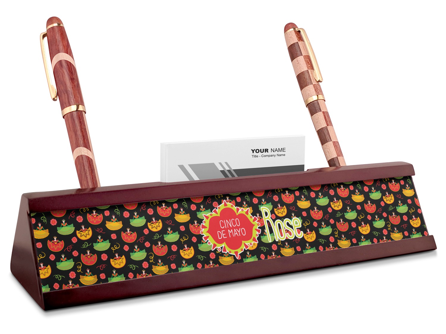 Your desk name plates are crafted from a high-quality, dark-cherry mahogany. At approximately 9.5 by 1.875 by 2.5 inches, this name plaque will fit perfectly, front and center, on your desk. Your customization spans across the entire face of the nameplate. Behind the nameplate lies a skinny slot that can fit approximately 15, traditionally-sized, business cards. You can also store your writing utensils on either side of this custom desk name plate.