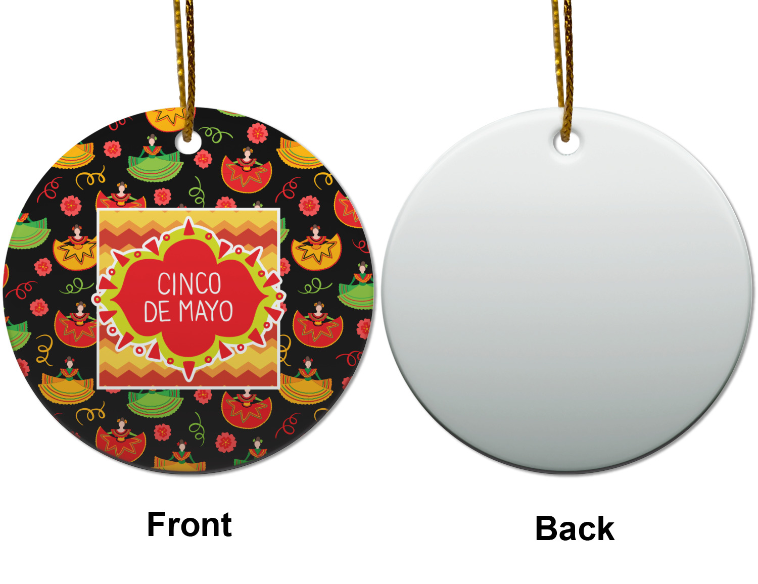 The design has two layers, one inside the other. The inner layer is a fun orange and red chevron. The outer layer has illustrated ladies wearing traditional Mexican skirts with flowers and confetti all around them. The background of this pattern is black, which really makes the bright colors of this pattern stand out. In the very middle of the design is a fun frame with the words "Cinco de Mayo" written inside.