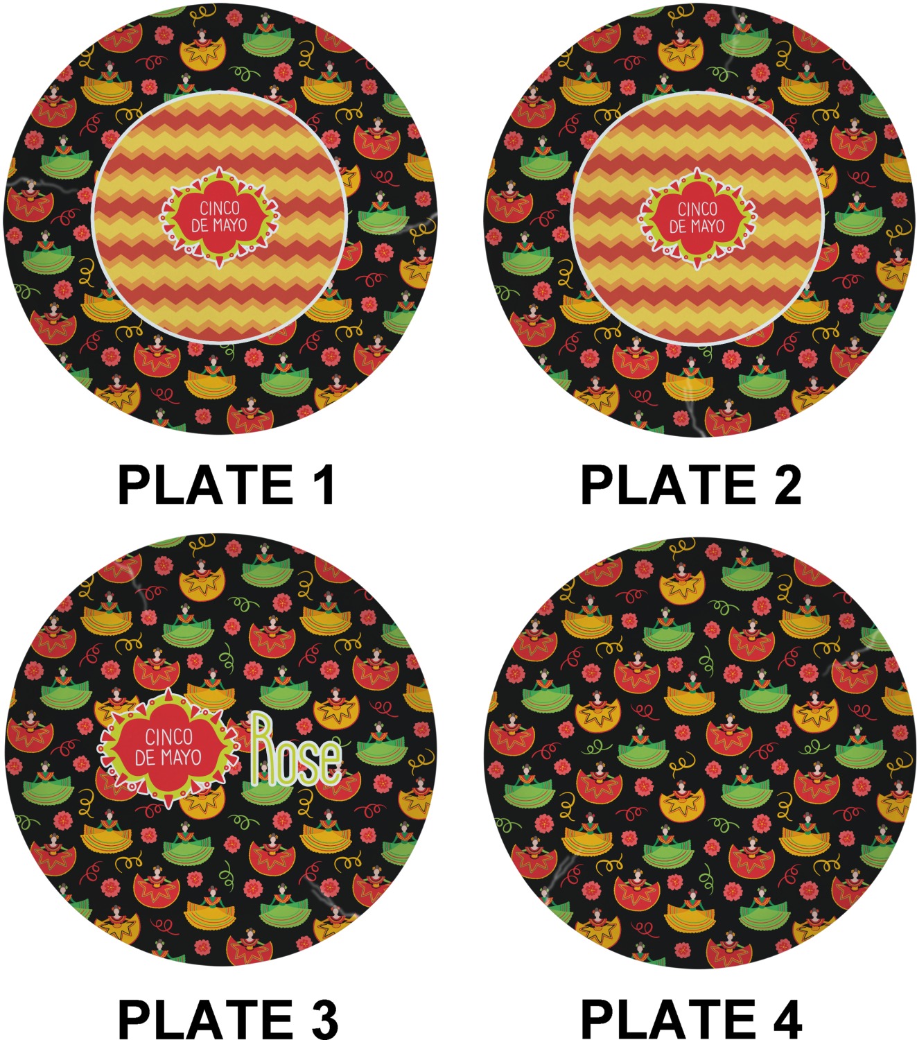 The design has two layers, one inside the other. The inner layer is a fun orange and red chevron. The outer layer has illustrated ladies wearing traditional Mexican skirts with flowers and confetti all around them. The background of this pattern is black, which really makes the bright colors of this pattern stand out. In the very middle of the design is a fun frame with the words "Cinco de Mayo" written inside.