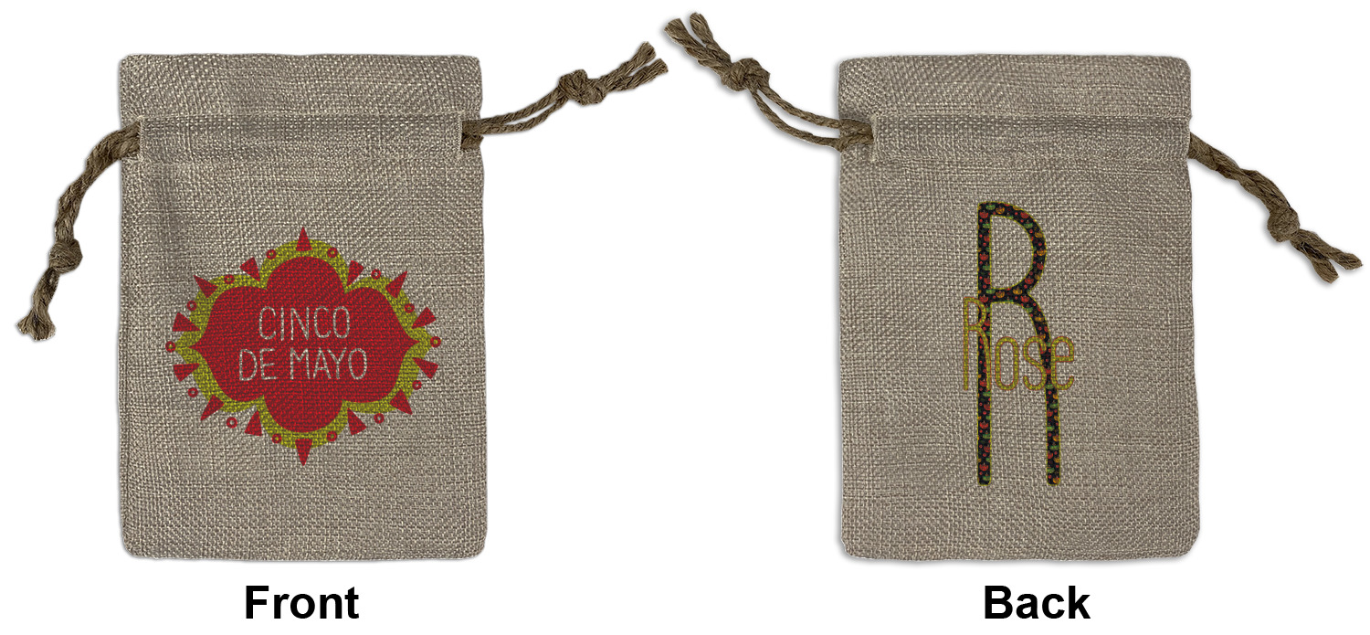 We sell our Burlap Gift Bags in 3 variant sized bags. Made with burlap polyester, each personalized bag can be secured with a twine drawstring pull. Your custom design is available to print on one side or both sides - completely up to you! The sizes of the bags measure approximately 4.5" x 6.5" for the smallest size, 6.5" x 8.0" for the medium size, and 6.5" x 13.5" for the large-sized bag.