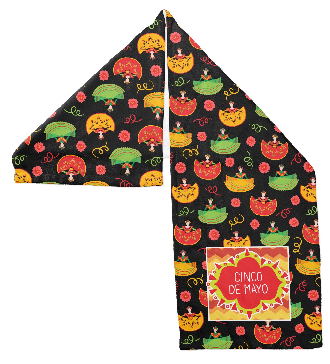 The design has two layers, one inside the other. The inner layer is a fun orange and red chevron. The outer layer has illustrated ladies wearing traditional Mexican skirts with flowers and confetti all around them. The background of this pattern is black, which really makes the bright colors of this pattern stand out. In the very middle of the design is a fun frame with the words "Cinco de Mayo" written inside.