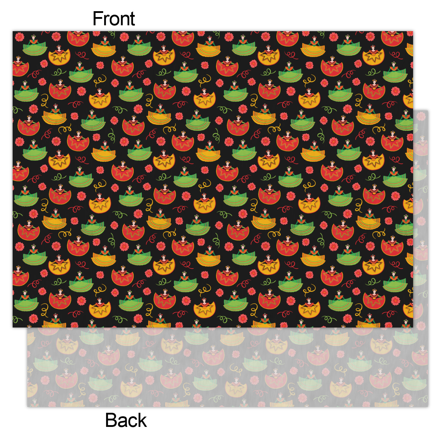 The design has two layers, one inside the other. The inner layer is a fun orange and red chevron. The outer layer has illustrated ladies wearing traditional Mexican skirts with flowers and confetti all around them. The background of this pattern is black, which really makes the bright colors of this pattern stand out. In the very middle of the design is a fun frame with the words "Cinco de Mayo" written inside.