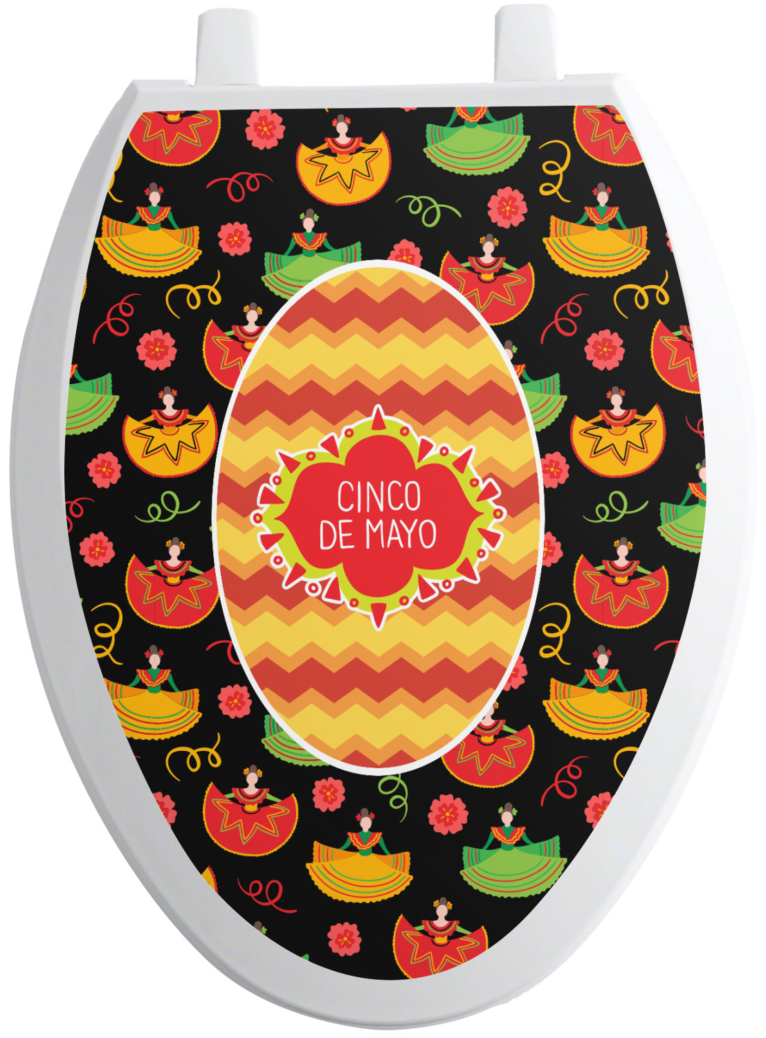 We sell these toilet lid decals in two different shapes to accommodate a wider range of toilet seat shapes. The first shape is our standard, round size, which measures at 13.5 by 12 inches. Our second option is an elongated shape, suited for long toilet seat covers. It measures 15 by 12 inches.