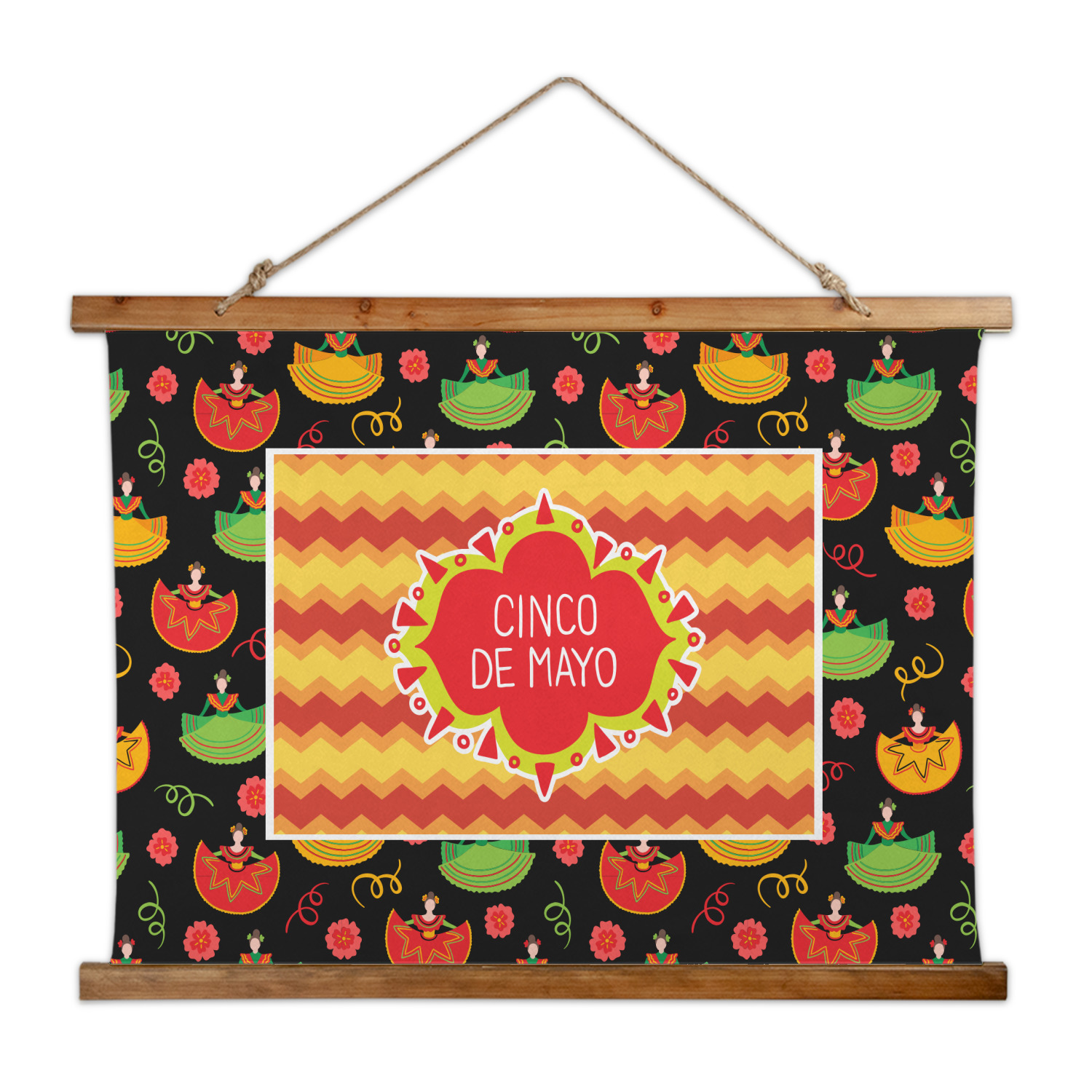 The design has two layers, one inside the other. The inner layer is a fun orange and red chevron. The outer layer has illustrated ladies wearing traditional Mexican skirts with flowers and confetti all around them. The background of this pattern is black, which really makes the bright colors of this pattern stand out. In the very middle of the design is a fun frame with the words "Cinco de Mayo" written inside.