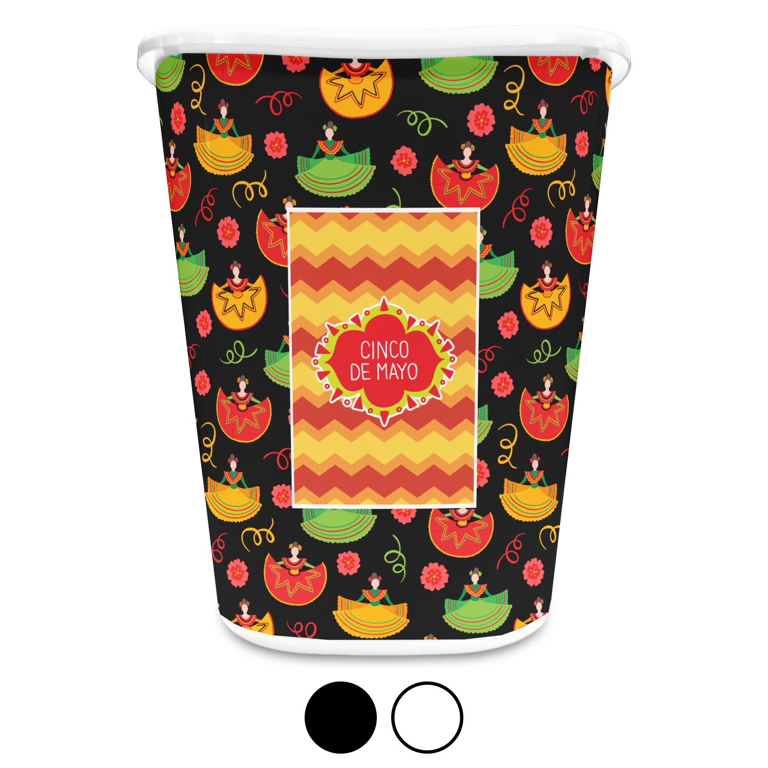 The design has two layers, one inside the other. The inner layer is a fun orange and red chevron. The outer layer has illustrated ladies wearing traditional Mexican skirts with flowers and confetti all around them. The background of this pattern is black, which really makes the bright colors of this pattern stand out. In the very middle of the design is a fun frame with the words "Cinco de Mayo" written inside.