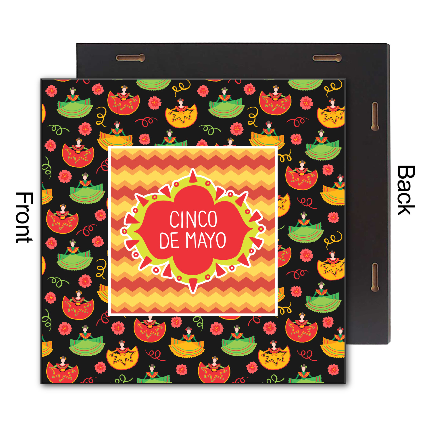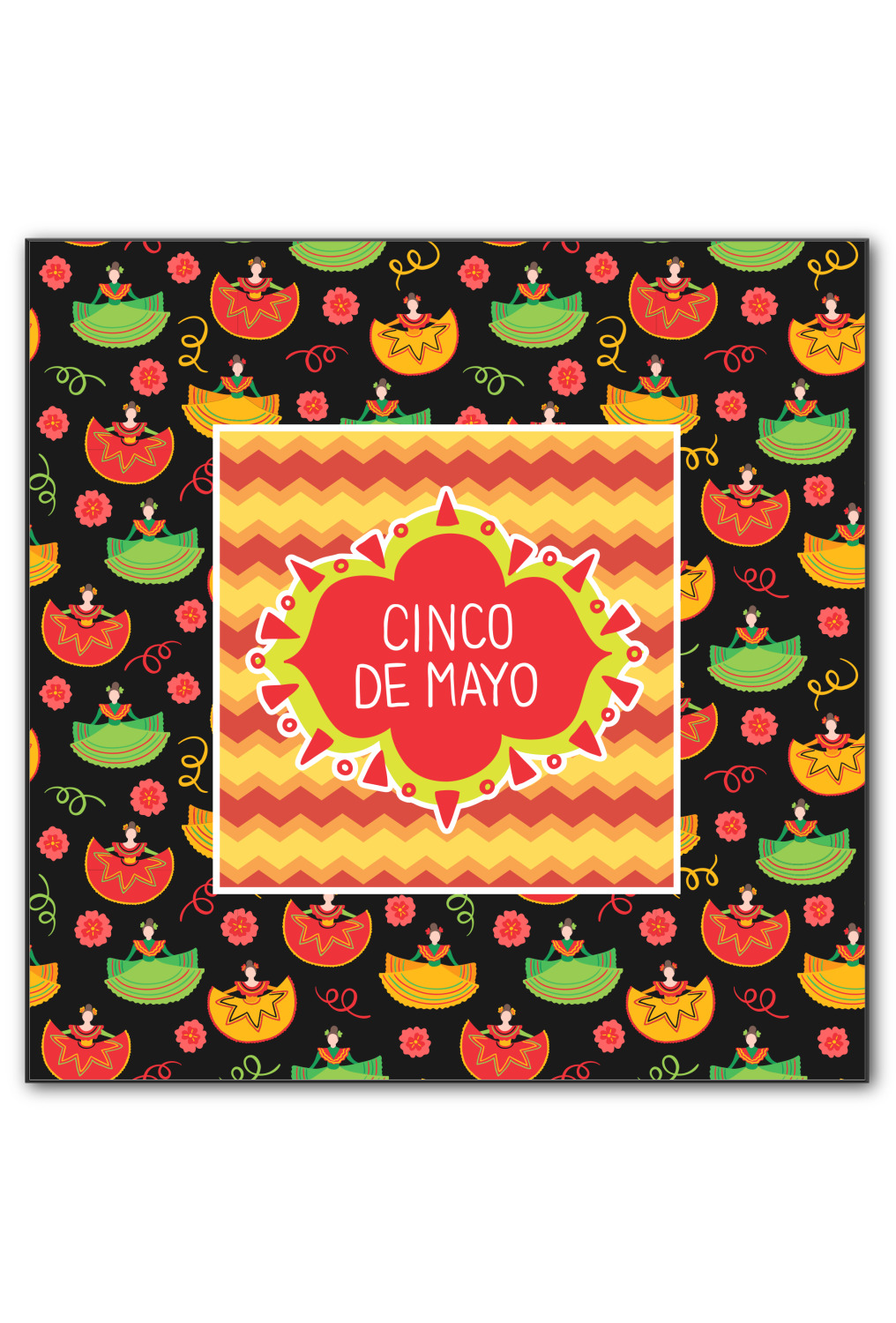 The design has two layers, one inside the other. The inner layer is a fun orange and red chevron. The outer layer has illustrated ladies wearing traditional Mexican skirts with flowers and confetti all around them. The background of this pattern is black, which really makes the bright colors of this pattern stand out. In the very middle of the design is a fun frame with the words "Cinco de Mayo" written inside.