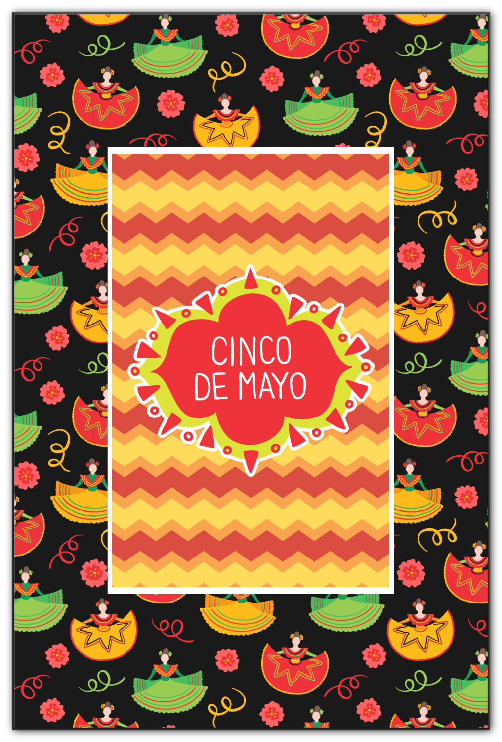 The design has two layers, one inside the other. The inner layer is a fun orange and red chevron. The outer layer has illustrated ladies wearing traditional Mexican skirts with flowers and confetti all around them. The background of this pattern is black, which really makes the bright colors of this pattern stand out. In the very middle of the design is a fun frame with the words "Cinco de Mayo" written inside.