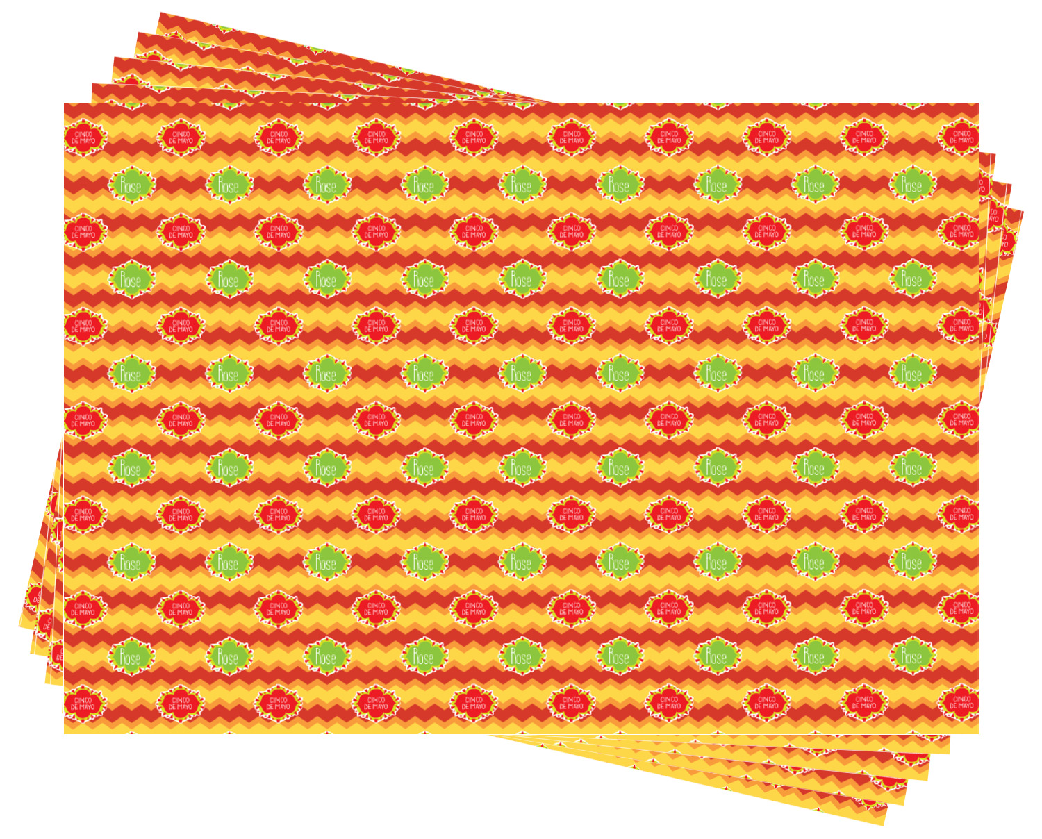 The design has two layers, one inside the other. The inner layer is a fun orange and red chevron. The outer layer has illustrated ladies wearing traditional Mexican skirts with flowers and confetti all around them. The background of this pattern is black, which really makes the bright colors of this pattern stand out. In the very middle of the design is a fun frame with the words "Cinco de Mayo" written inside.